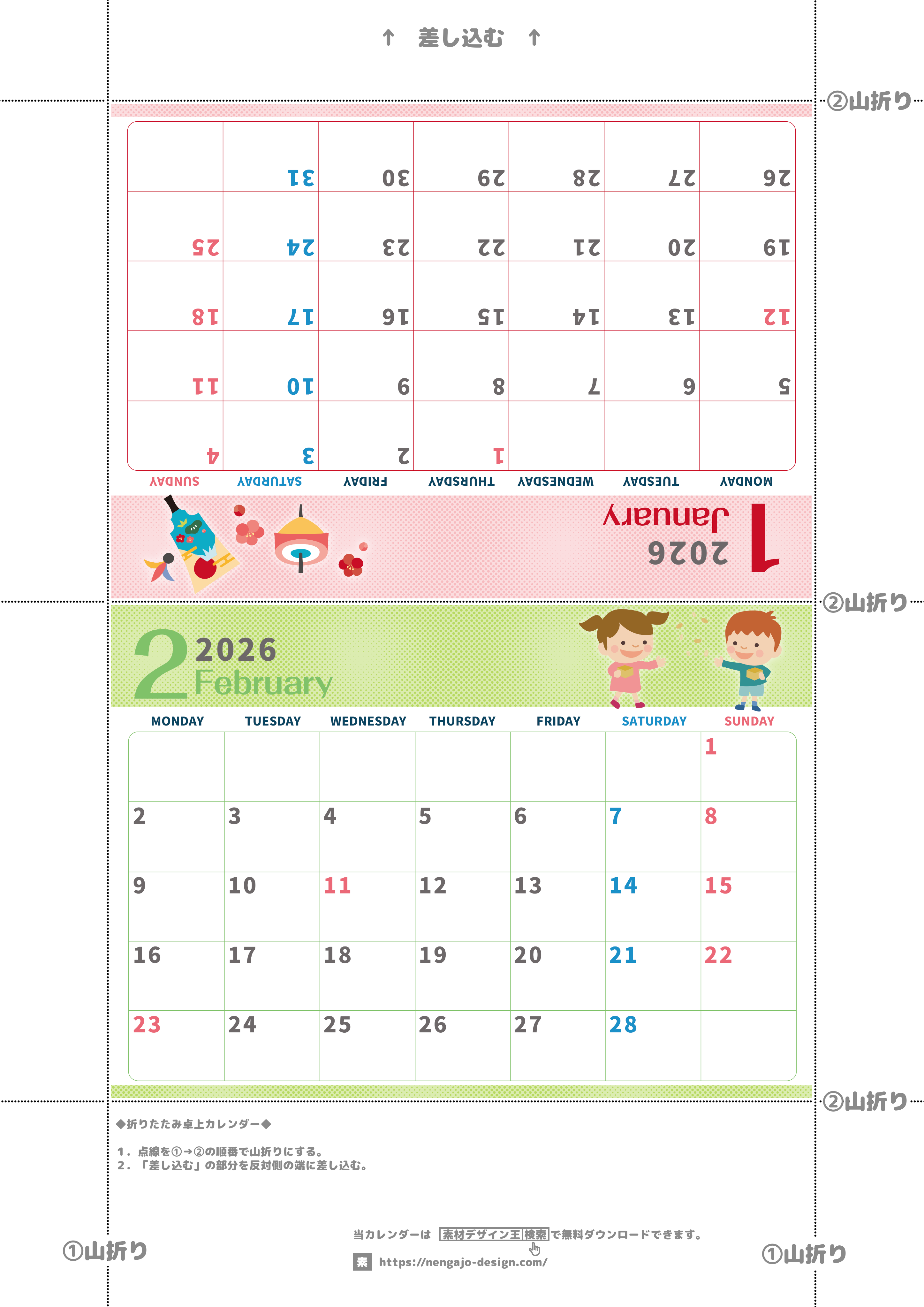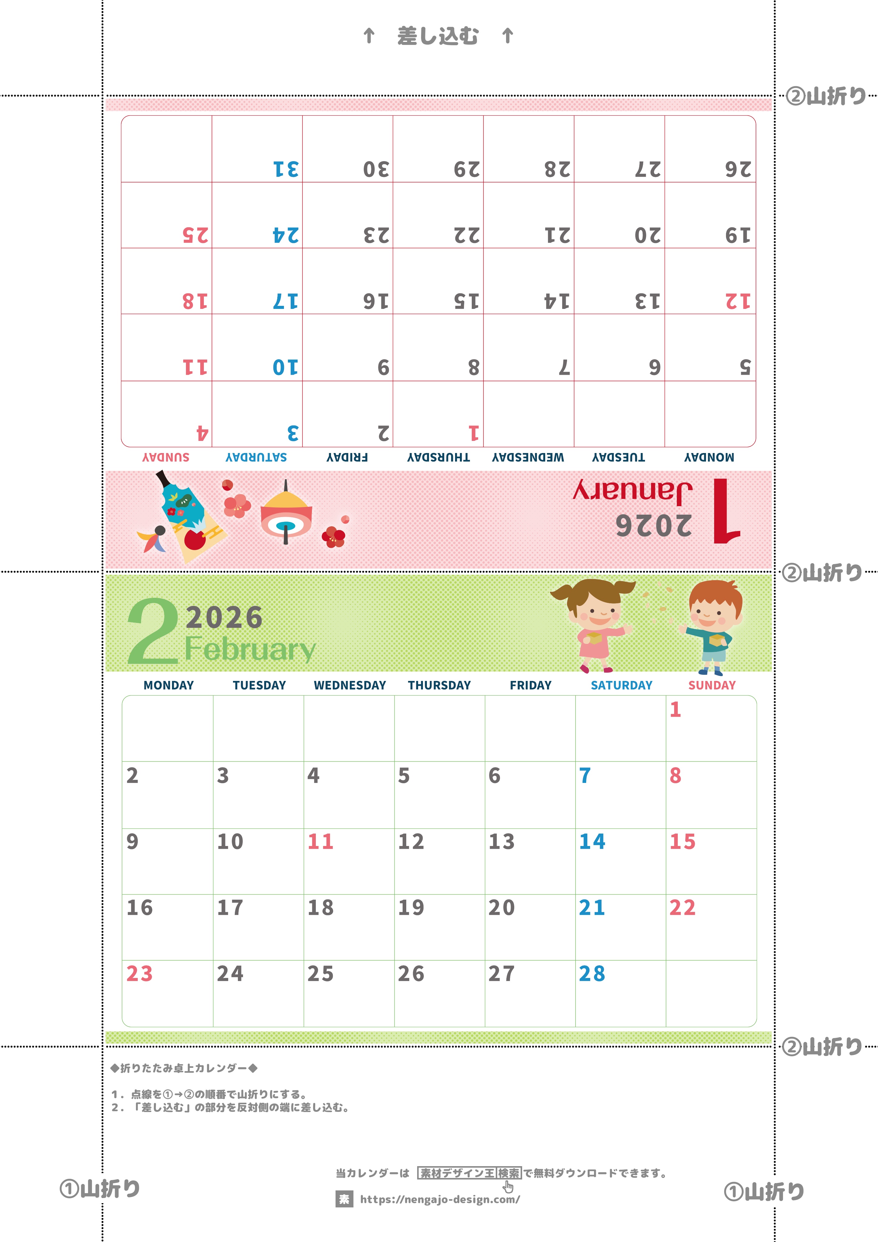 2026年の卓上カレンダー(1月・2月)は月曜始まり♪かわいい書き込みしやすい日付欄大きめのA4無料素材♪(2026-001001-0231)
