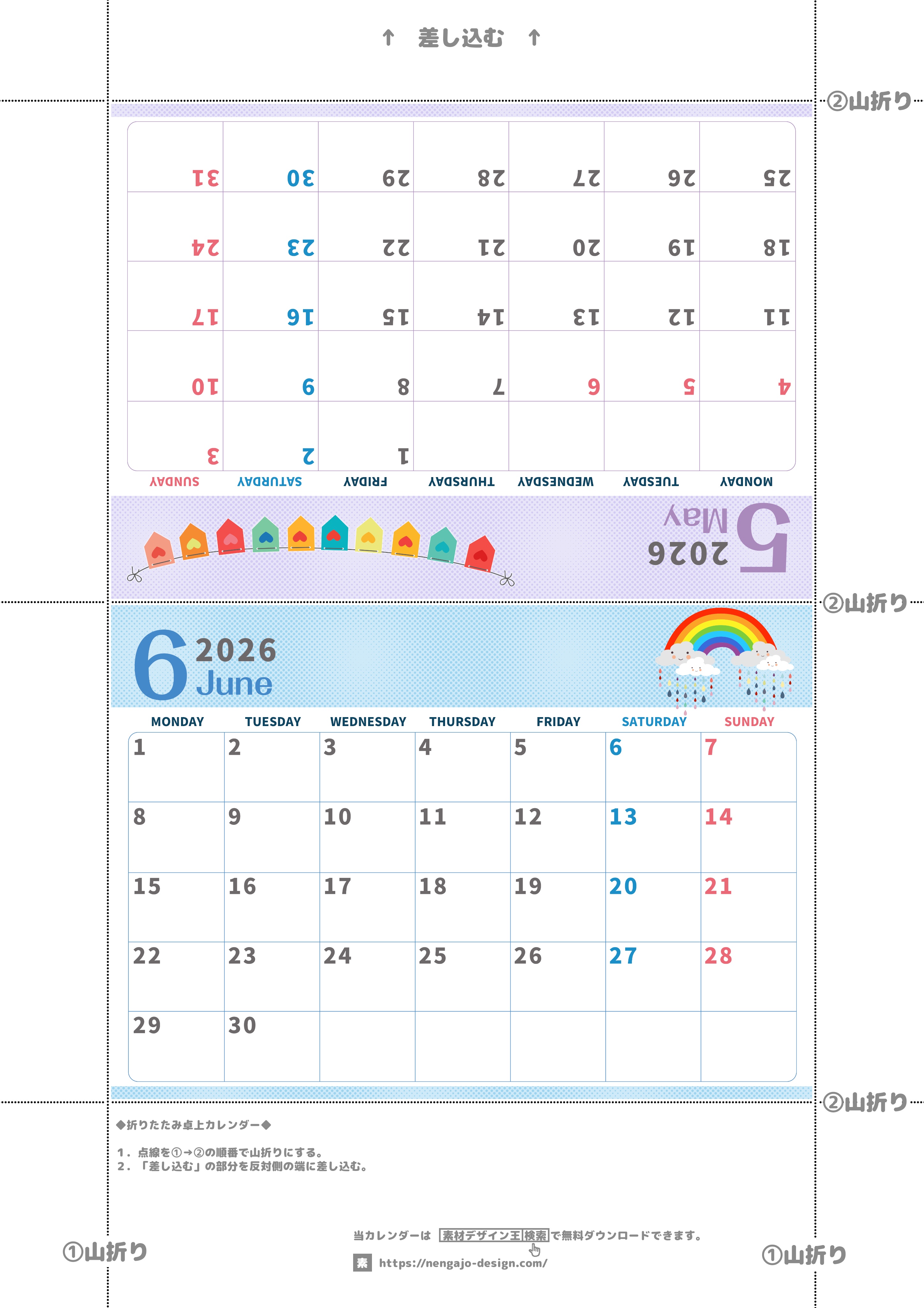 2026年・無料のカレンダーテンプレート 2026年の卓上カレンダー(5月・6月)は月曜始まり♪かわいい書き込みしやすい日付欄大きめのA4無料素材♪(2026-001005-0631) 素材状デザイン王 2025年4月14日 2026年の卓上カレンダー(5月・6月)は月曜始まり♪かわいい書き込みしやすい日付欄大きめのA4無料素材♪(2026-001005-0631) かわいい カレンダーデザイン-0010 5月 6月 家族 月曜始まり 卓上