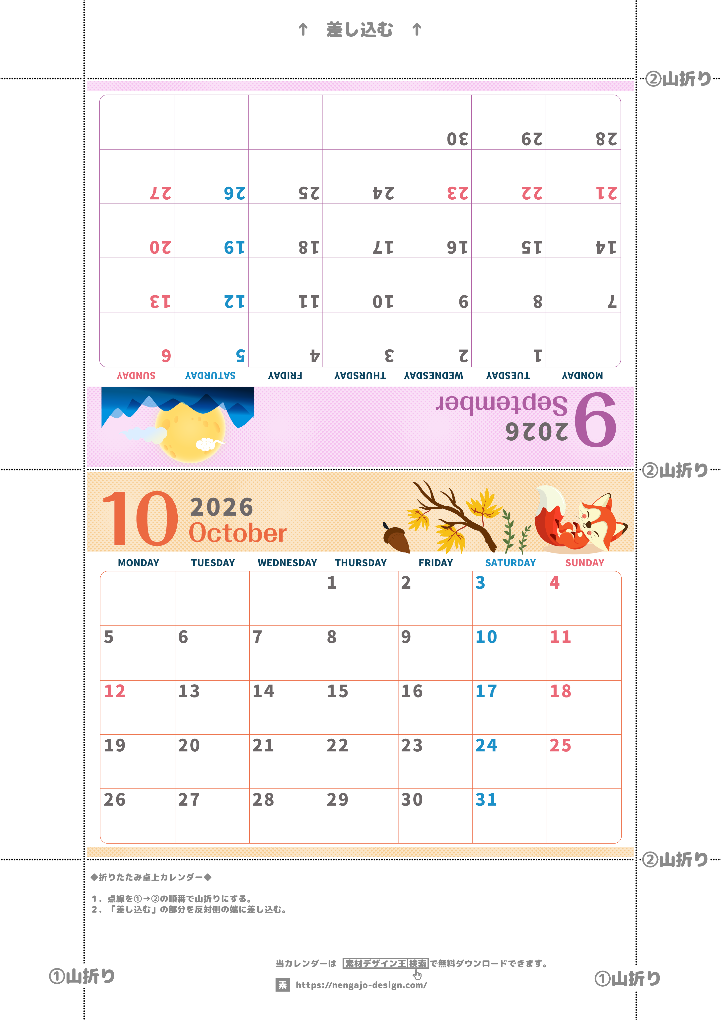 2026年・無料のカレンダーテンプレート 2026年の卓上カレンダー(9月・10月)は月曜始まり♪かわいい書き込みしやすい日付欄大きめのA4無料素材♪(2026-001009-1031) 素材状デザイン王 2025年4月14日 2026年の卓上カレンダー(9月・10月)は月曜始まり♪かわいい書き込みしやすい日付欄大きめのA4無料素材♪(2026-001009-1031) かわいい カレンダーデザイン-0010 9月 10月 家族 月曜始まり 卓上