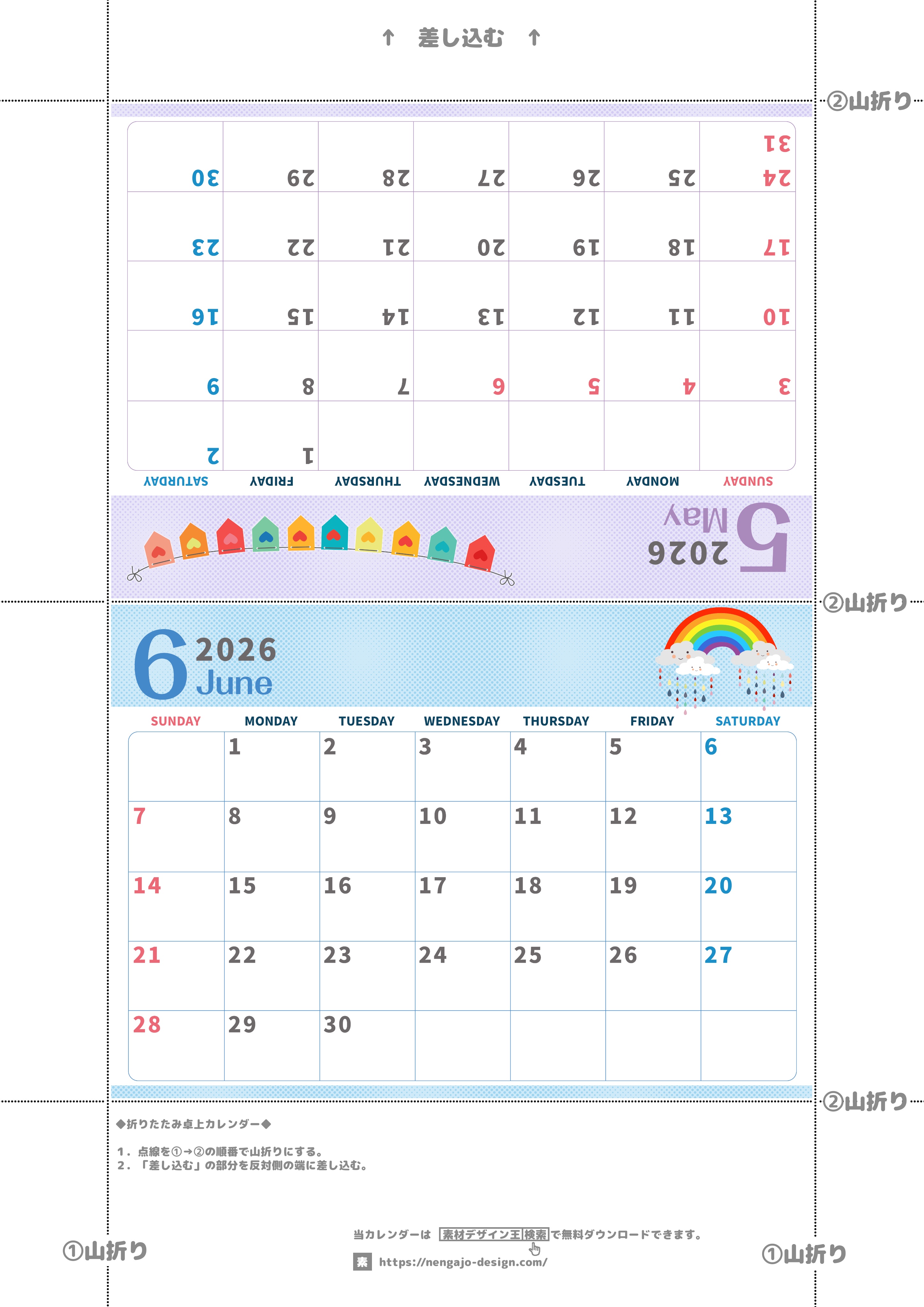 2026年・無料のカレンダーテンプレート 2026年の卓上カレンダー(5月・6月)は日曜始まり♪かわいい書き込みしやすい日付欄大きめのA4無料素材♪(2026-001005-0630) 素材状デザイン王 2025年4月14日 2026年の卓上カレンダー(5月・6月)は日曜始まりです。かわいいだけでなく書き込みもしやすい日付欄が大きめのA4無料素材となっています。ダウンロードして印刷利用ください。(2026-001005-0630) かわいい カレンダーデザイン-0010 5月 6月 家族 日曜始まり 卓上