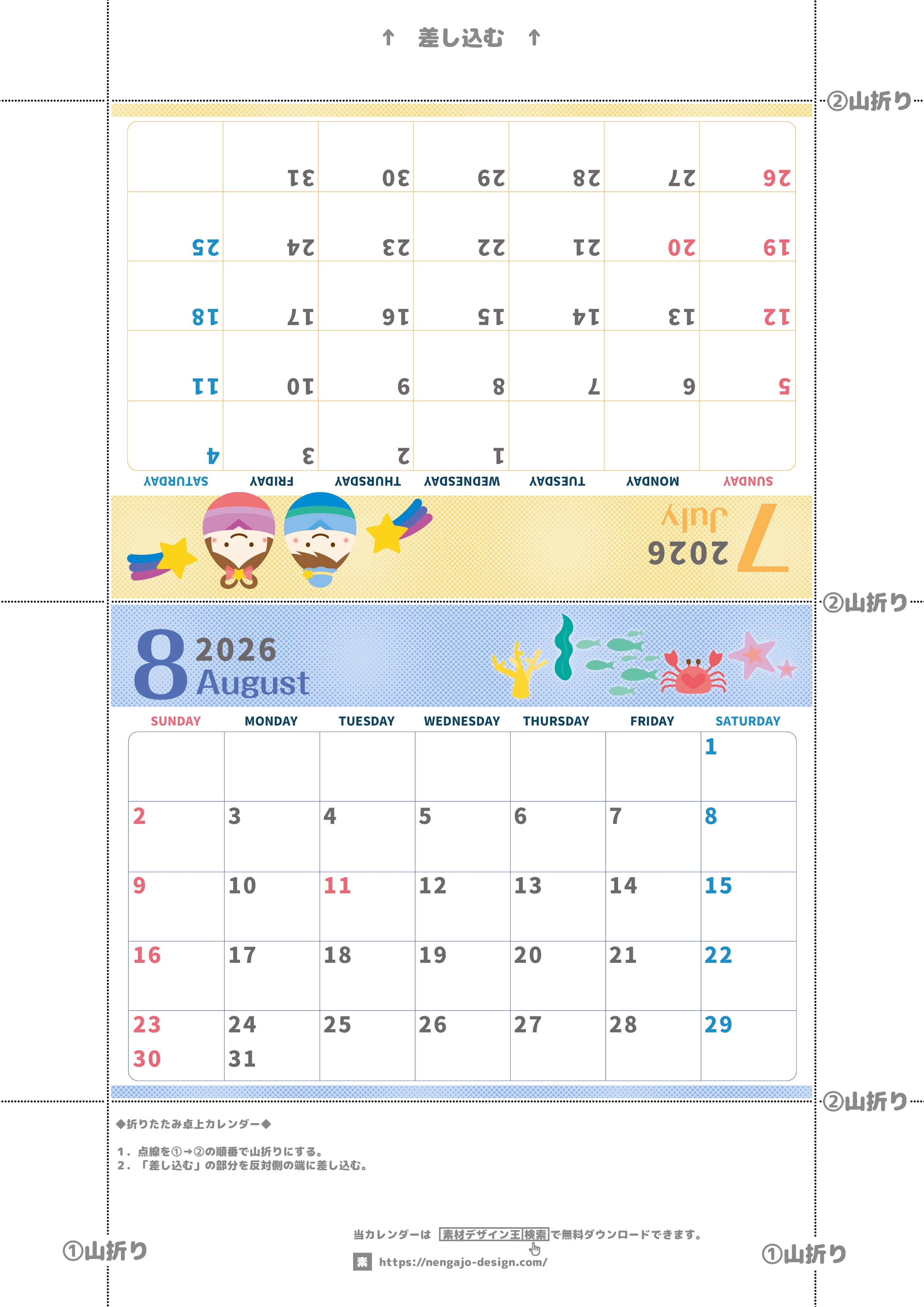 2026年・無料のカレンダーテンプレート 2026年の卓上カレンダー(7月・8月)は日曜始まり♪かわいい書き込みしやすい日付欄大きめのA4無料素材♪(2026-001007-0830) 素材状デザイン王 2025年4月14日 2026年の卓上カレンダー(7月・8月)は日曜始まりです。かわいいだけでなく書き込みもしやすい日付欄が大きめのA4無料素材となっています。ダウンロードして印刷利用ください。(2026-001007-0830) かわいい カレンダーデザイン-0010 7月 8月 家族 日曜始まり 卓上