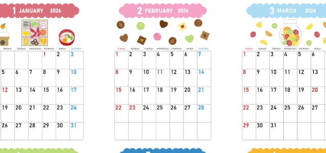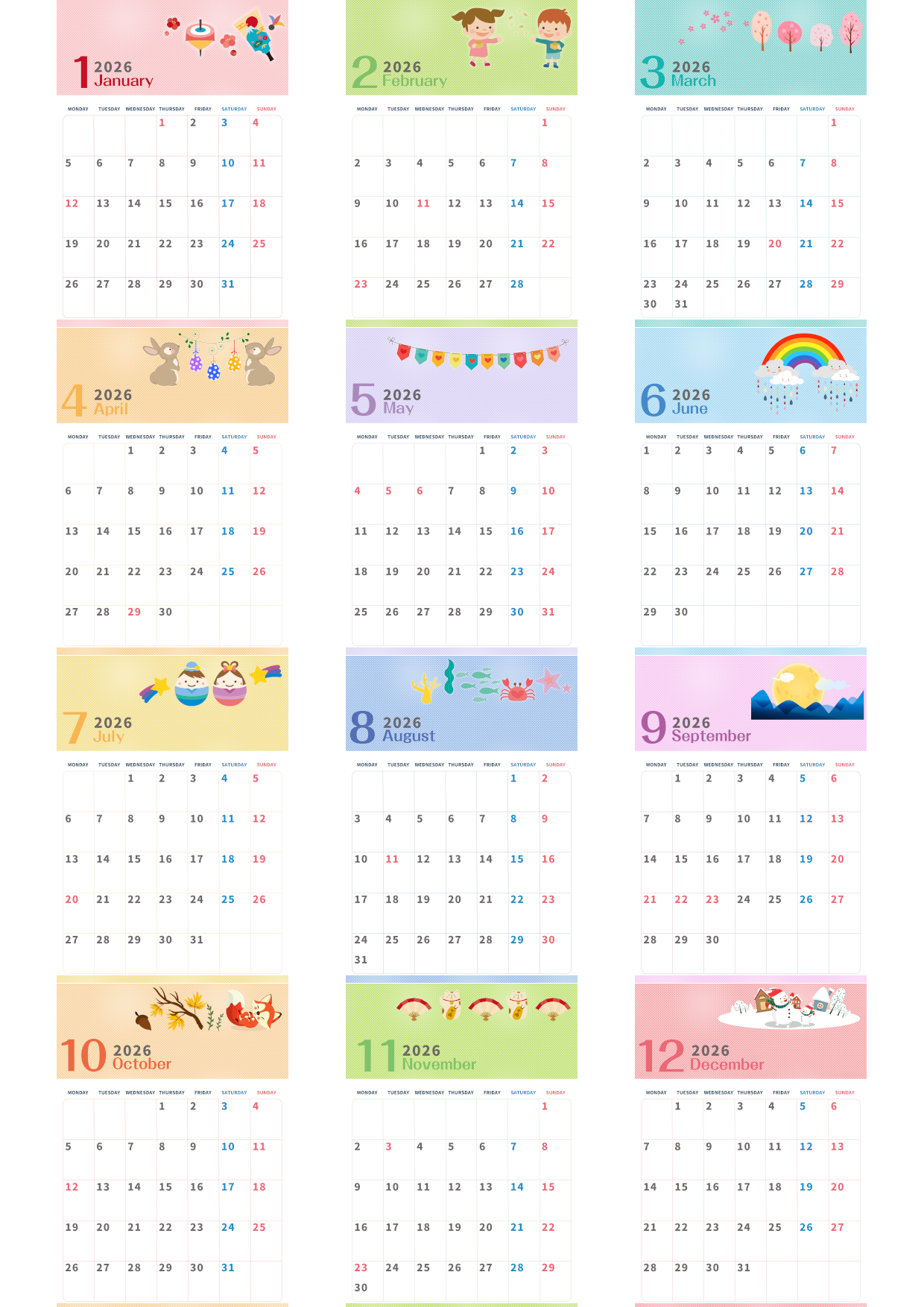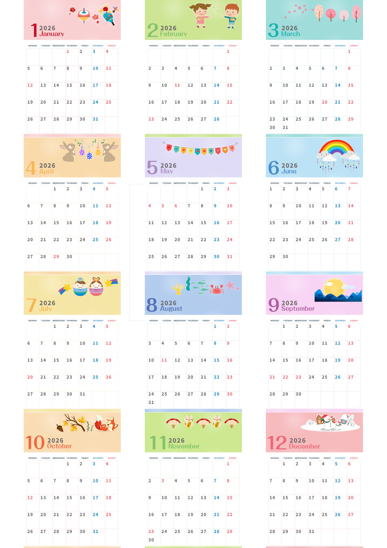 年間カレンダー2026を無料ダウンロードできます。A4縦型の月曜始まりで、計画管理が楽しく続けられるデザインです。長期スケジュールの把握や目標達成のために役立ち、毎日の予定確認が楽しくなります。実用性と親しみやすさを兼ね備えたカレンダーです。