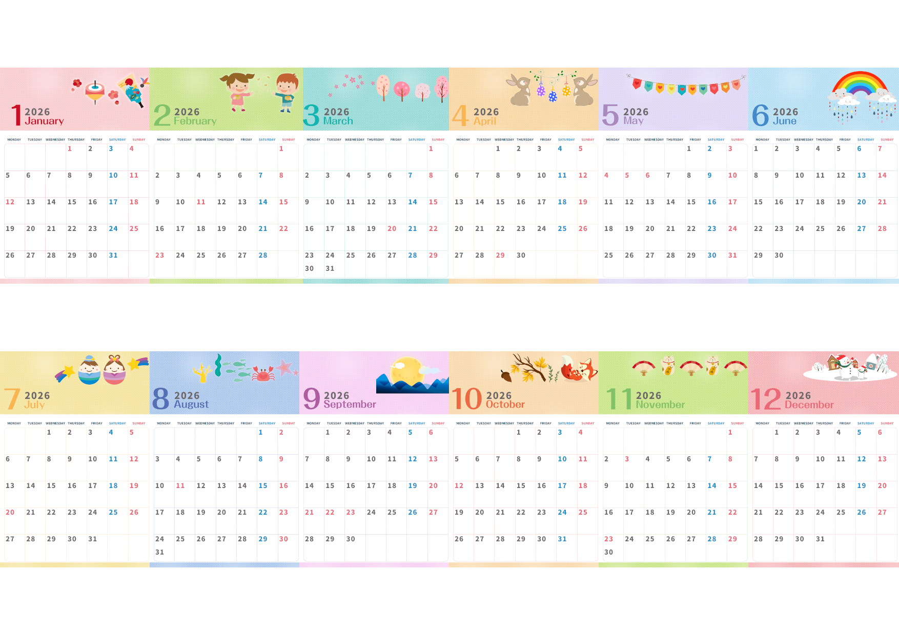 2026年版年間カレンダー♪A4縦型の月曜始まりでイベント管理に最適な実用的構成!無料でダウンロードできます!