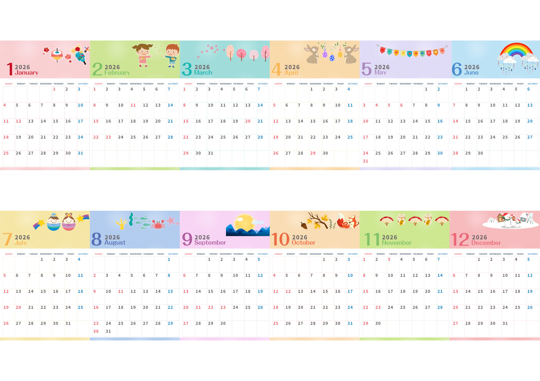 A4縦型で使える2026年間カレンダー♪日曜始まりでスケジュールが立てやすい実用デザイン!無料ダウンロードできます!