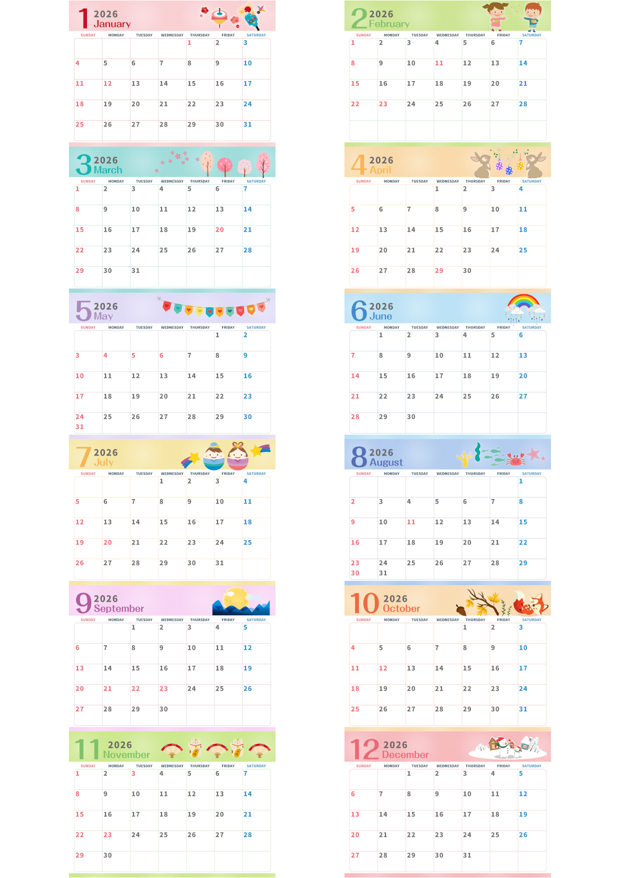 2026年間カレンダーを無料ダウンロードできます。A4横型の日曜始まりで、イベントを整理しやすいかわいいデザインです。家族の予定や学校行事、習い事の管理に最適で、壁に貼るだけで確認がしやすくなります。実用性とデザイン性を両立した年間カレンダーです。