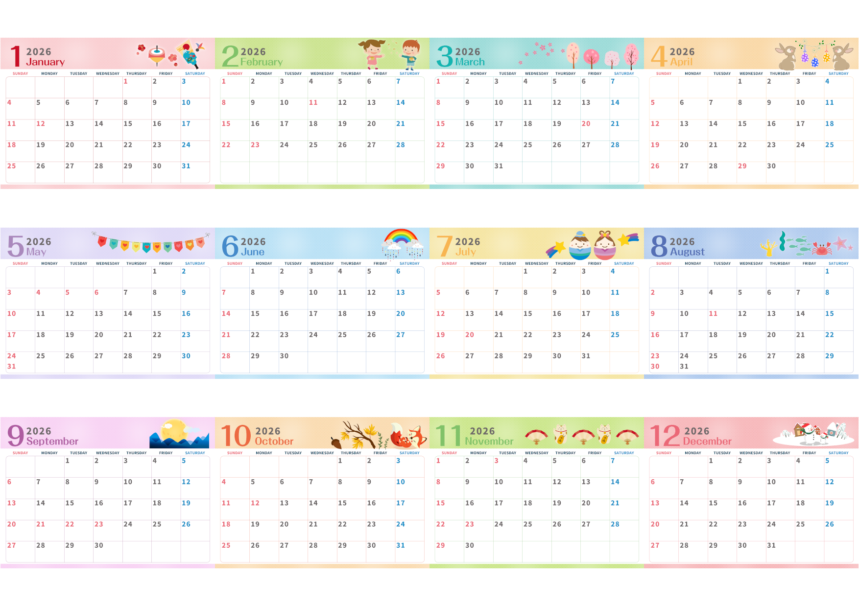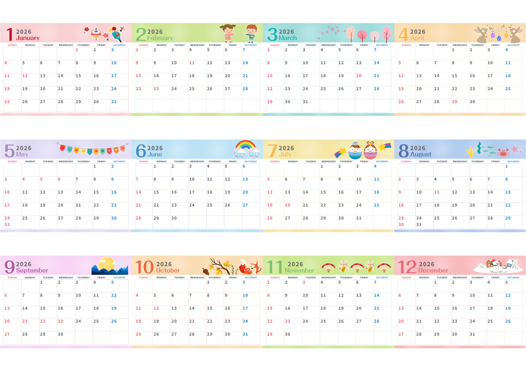 A4一枚で使える2026年年間カレンダーを無料ダウンロードできます。横向きの日曜始まりで、計画が立てやすい実用イラストが特徴です。年間の流れを一覧で把握でき、旅行計画や受験スケジュールにも活用できます。飾っても馴染む明るい雰囲気のデザインです。