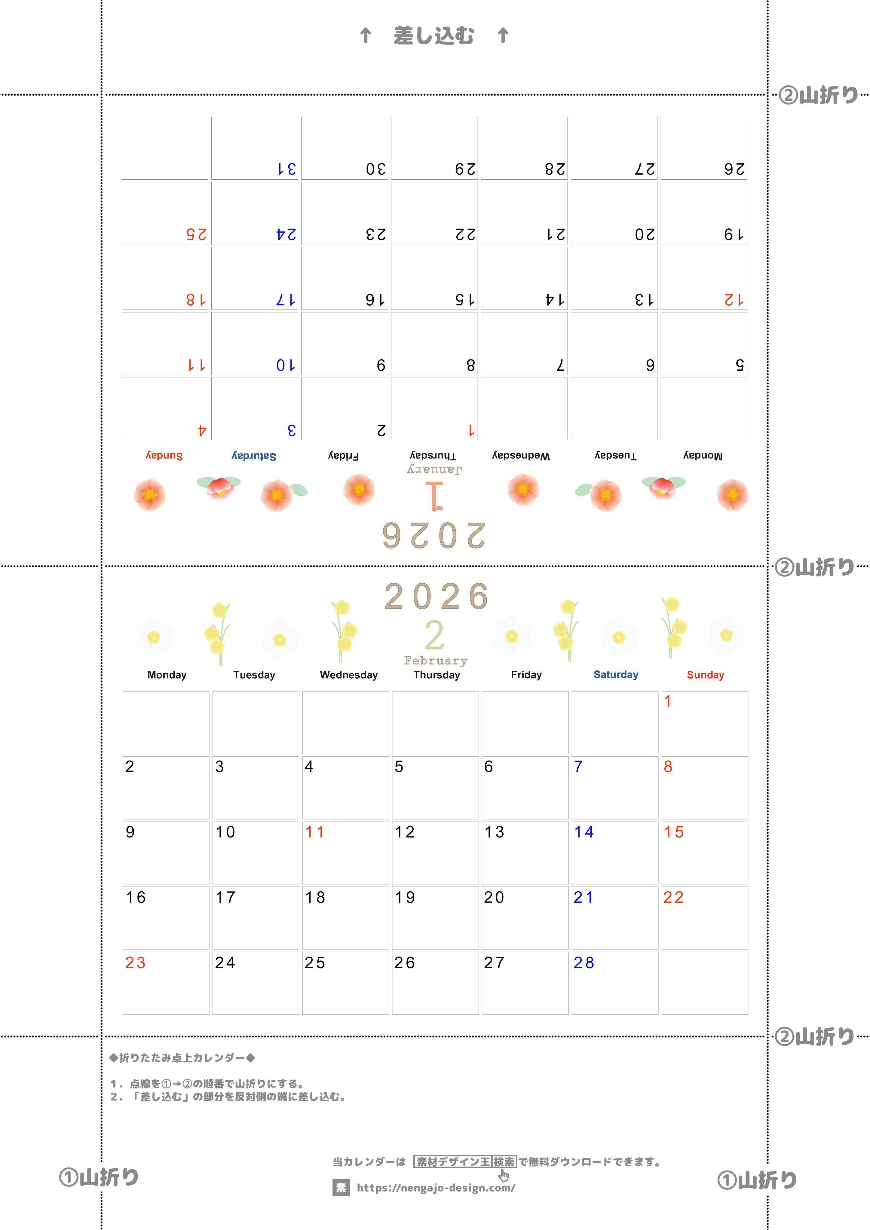 2026年の卓上カレンダー(1月・2月)は月曜始まり♪おしゃれなオリジナルイラスト素材♪家族にもおすすめ♪A4/無料(2026-001101-0231)