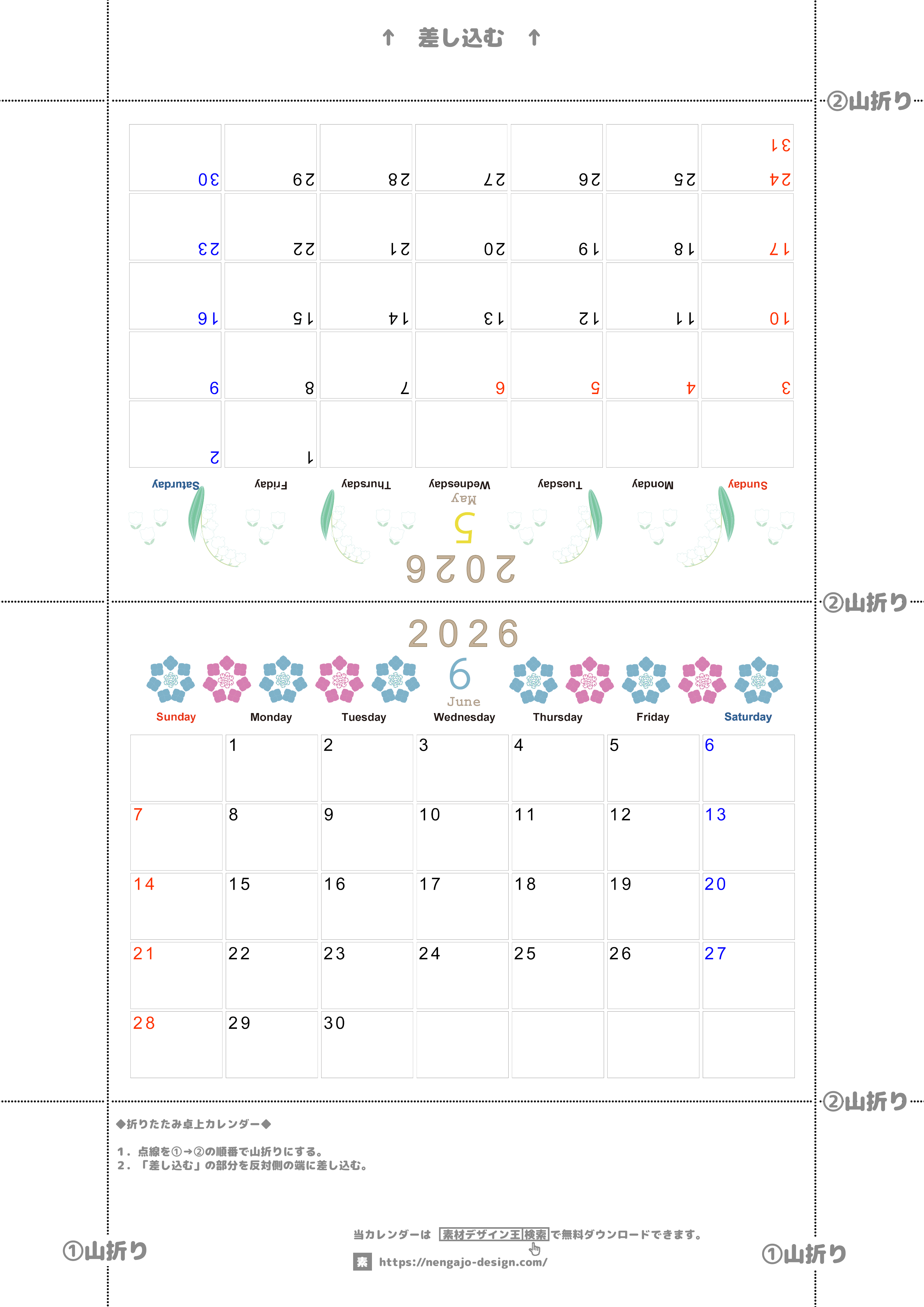2026年・無料のカレンダーテンプレート 2026年の卓上カレンダー(5月・6月)は日曜始まり♪おしゃれなオリジナルイラスト素材♪家族にもおすすめ♪A4/無料(2026-001105-0630) 素材状デザイン王 2025年4月14日 2026年の卓上カレンダー(5月・6月)は日曜始まりです。おしゃれなオリジナルのイラストが施された品質の高い素材となっています。家族にもおすすめの見やすい大きめデザインです。A4用紙に印刷できるので汎用性が高く無料にてダウンロードが可能です。(2026-001105-0630) おしゃれ カレンダーデザイン-0011 5月 6月 草花 日曜始まり 卓上