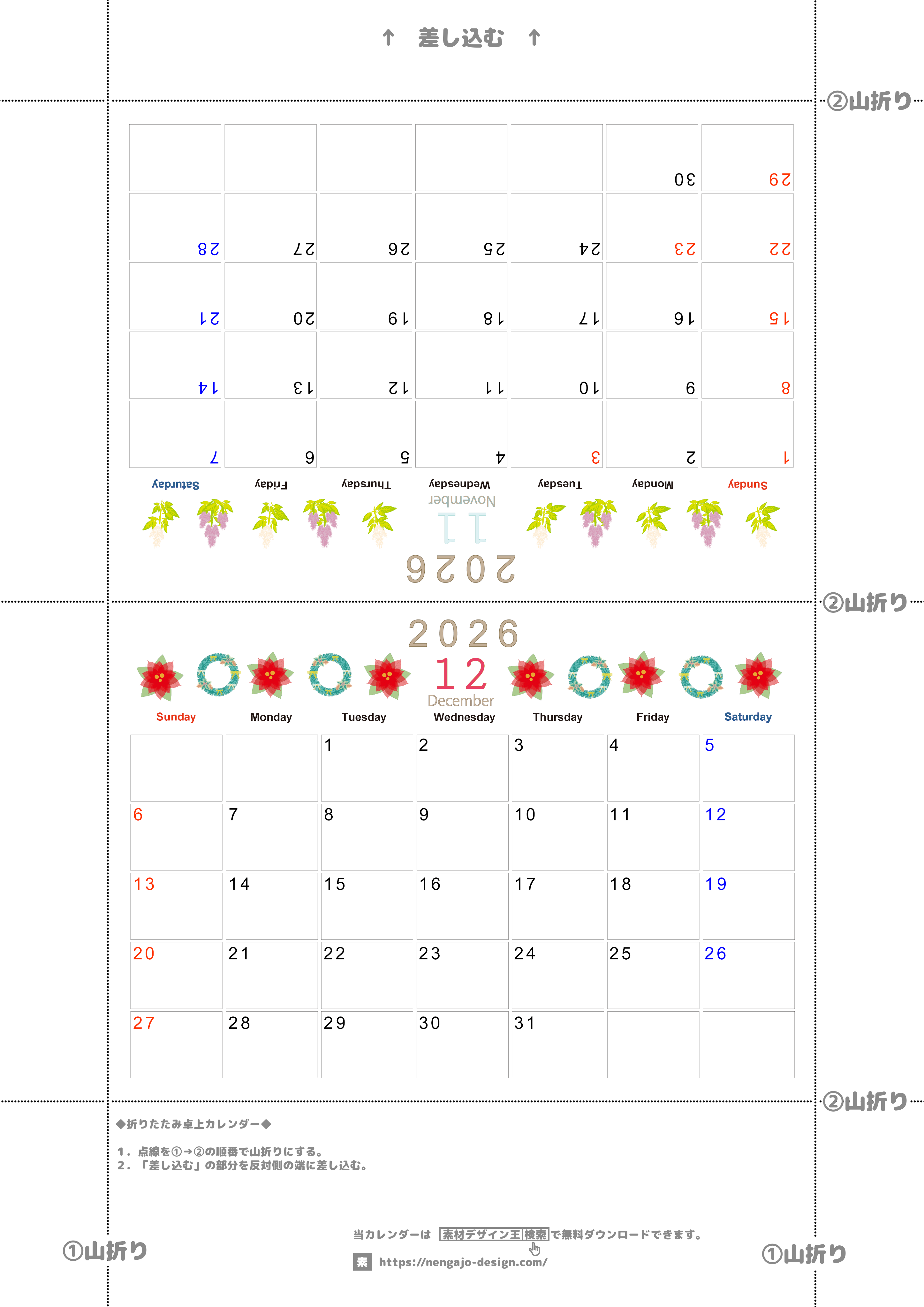2026年・無料のカレンダーテンプレート 2026年の卓上カレンダー(11月・12月)は日曜始まり♪おしゃれなオリジナルイラスト素材♪家族にもおすすめ♪A4/無料(2026-001111-1230) 素材状デザイン王 2025年4月14日 2026年の卓上カレンダー(11月・12月)は日曜始まりです。おしゃれなオリジナルのイラストが施された品質の高い素材となっています。家族にもおすすめの見やすい大きめデザインです。A4用紙に印刷できるので汎用性が高く無料にてダウンロードが可能です。(2026-001111-1230) おしゃれ カレンダーデザイン-0011 11月 12月 草花 日曜始まり 卓上
