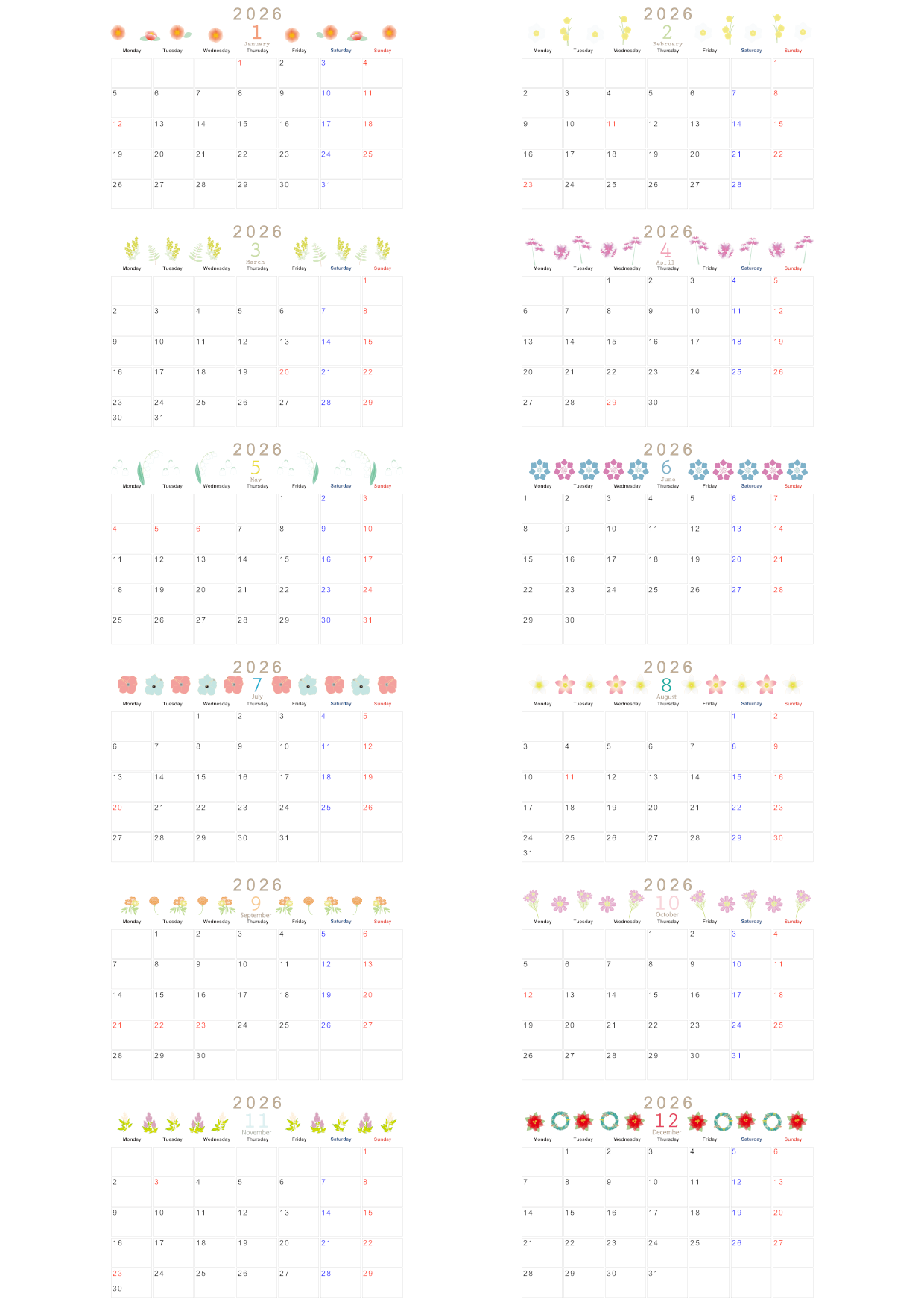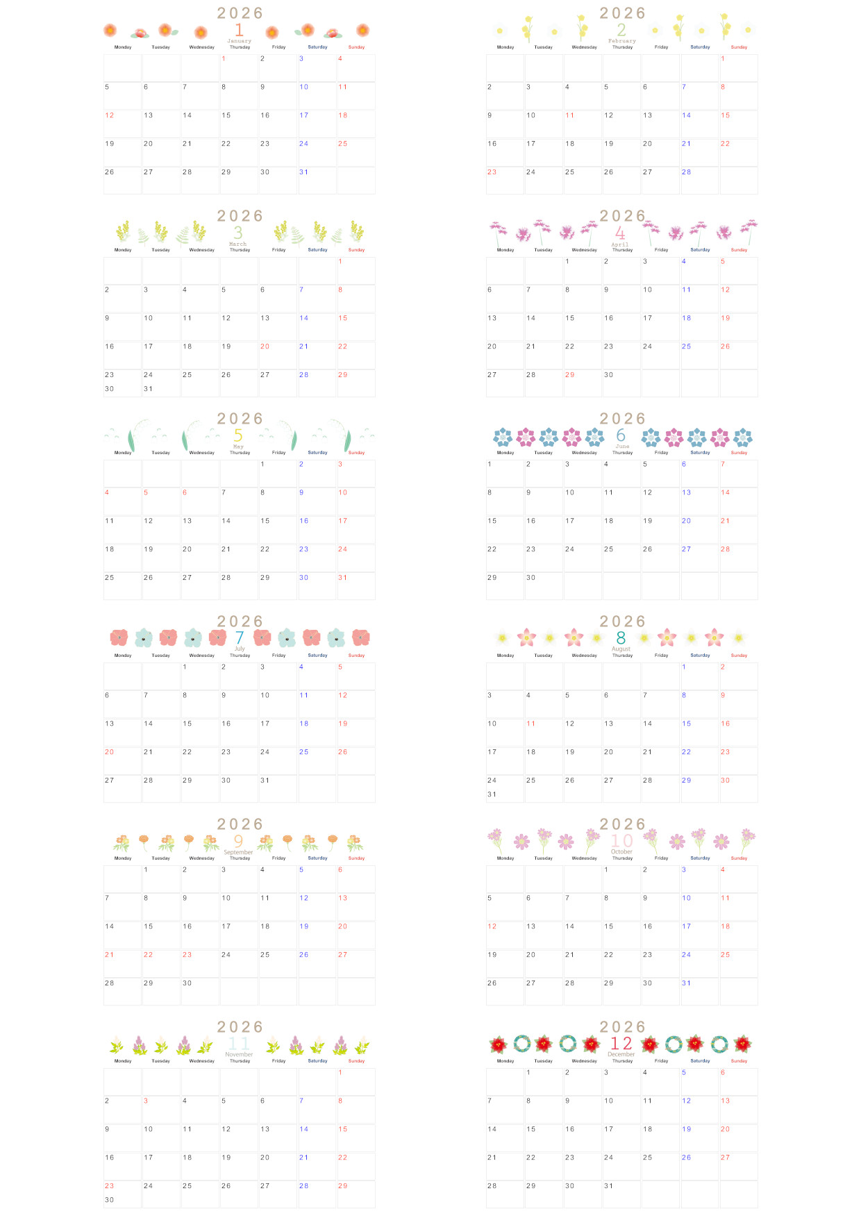 2026年の年間カレンダーを無料ダウンロードできます。A4横型の月曜始まりで、シンプルでおしゃれな花イラストが魅力です。数字や曜日の視認性が高く、書き込みスペースも確保されているため、実用性を求める方にぴったりです。仕事の年間目標やイベント計画にも役立つ、使い心地の良いレイアウトです。飾っても主張しすぎない落ち着いた花デザインで、長く愛用できるカレンダーです。