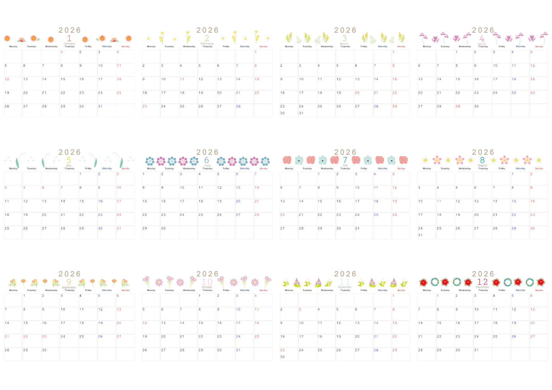 2026年間カレンダーを無料ダウンロードできます。A4横型の月曜始まりで、上品な花イラストが整った印象を与えるデザインです。視認性の高いレイアウトで予定が整理しやすく、年間を通して使いやすいフリー素材です。家庭用としても職場用としても自然に馴染み、壁に貼るだけで上質な雰囲気になります。実用性とデザイン性を求める方におすすめの年間カレンダーです。