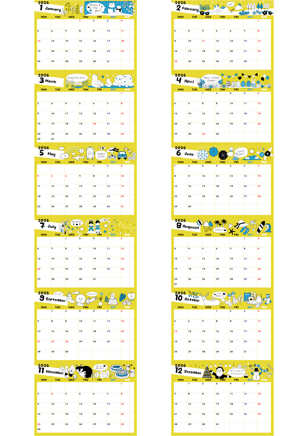 2026年の年間カレンダーを無料ダウンロードできます。A4横型の月曜始まりで、ポップでかわいい北欧カラーのアクセントが気分を上げてくれるデザインです。視認性の高い構成で、予定やイベントの管理がしやすく、書き込みにも適しています。家庭でも職場でも使いやすい万能タイプの年間カレンダーです。