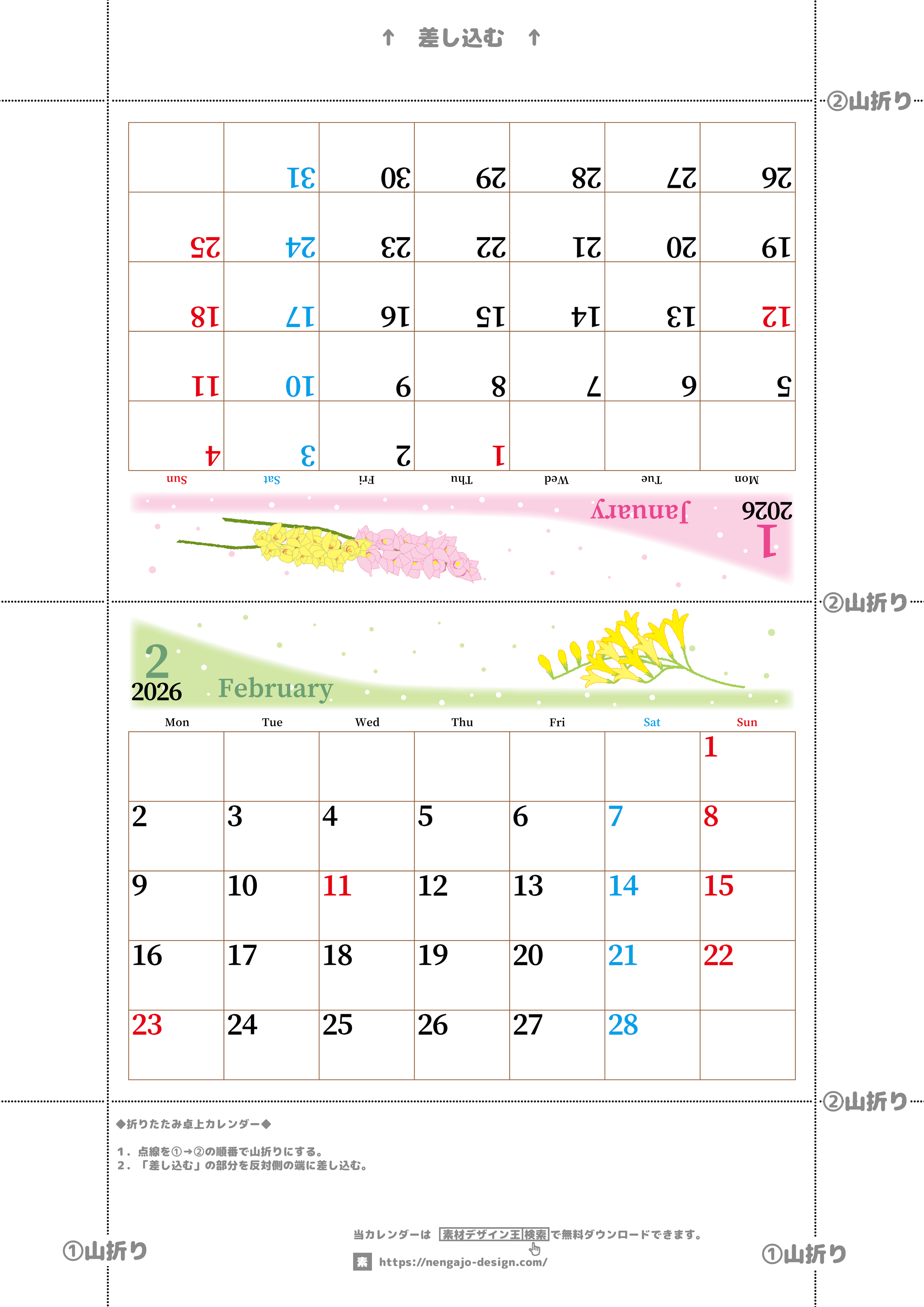 2026年の卓上カレンダー(1月・2月)は月曜始まり♪おしゃれで大きめ♪折り方が簡単で無料(A4)(2026-001301-0231)