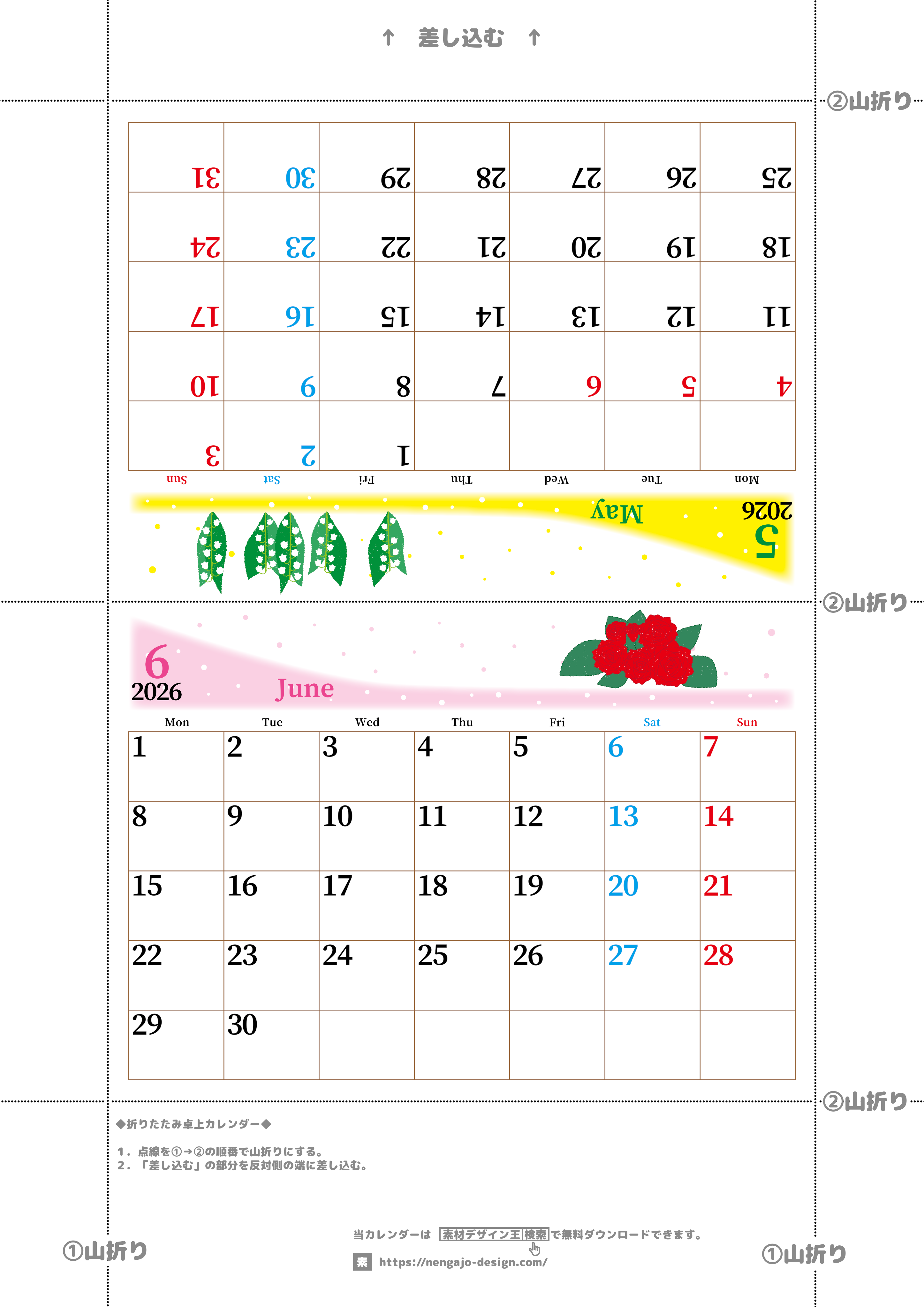 2026年・無料のカレンダーテンプレート 2026年の卓上カレンダー(5月・6月)は月曜始まり♪おしゃれで大きめ♪折り方が簡単で無料(A4)(2026-001305-0631) 素材状デザイン王 2025年4月14日 2026年の卓上カレンダー(5月・6月)は月曜始まり♪おしゃれで大きめ♪折り方が簡単で無料(A4)(2026-001305-0631) おしゃれ カレンダーデザイン-0013 5月 6月 草花 月曜始まり 卓上