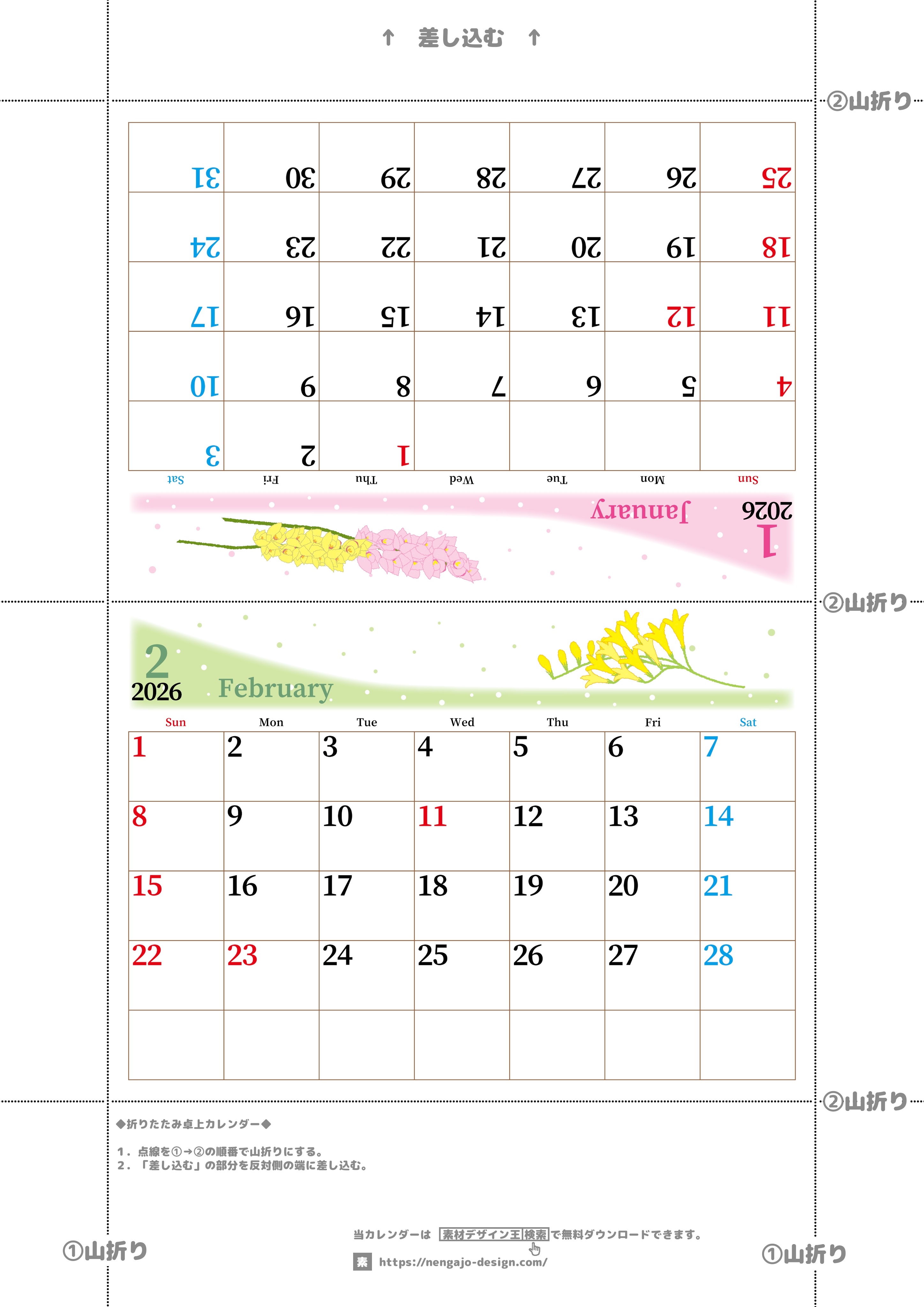 2026年・無料のカレンダーテンプレート 2026年の卓上カレンダー(1月・2月)は日曜始まり♪おしゃれで大きめ♪折り方が簡単で無料(A4)(2026-001301-0230) 素材状デザイン王 2025年4月14日 2026年の卓上カレンダー(1月・2月)は日曜始まりです。おしゃれで大きめなので見やすいです。折り方が簡単ですぐに卓上カレンダーとして使えます。無料でダウンロードしてA4用紙にすぐ印刷が行えます。(2026-001301-0230) おしゃれ カレンダーデザイン-0013 1月 2月 草花 日曜始まり 卓上