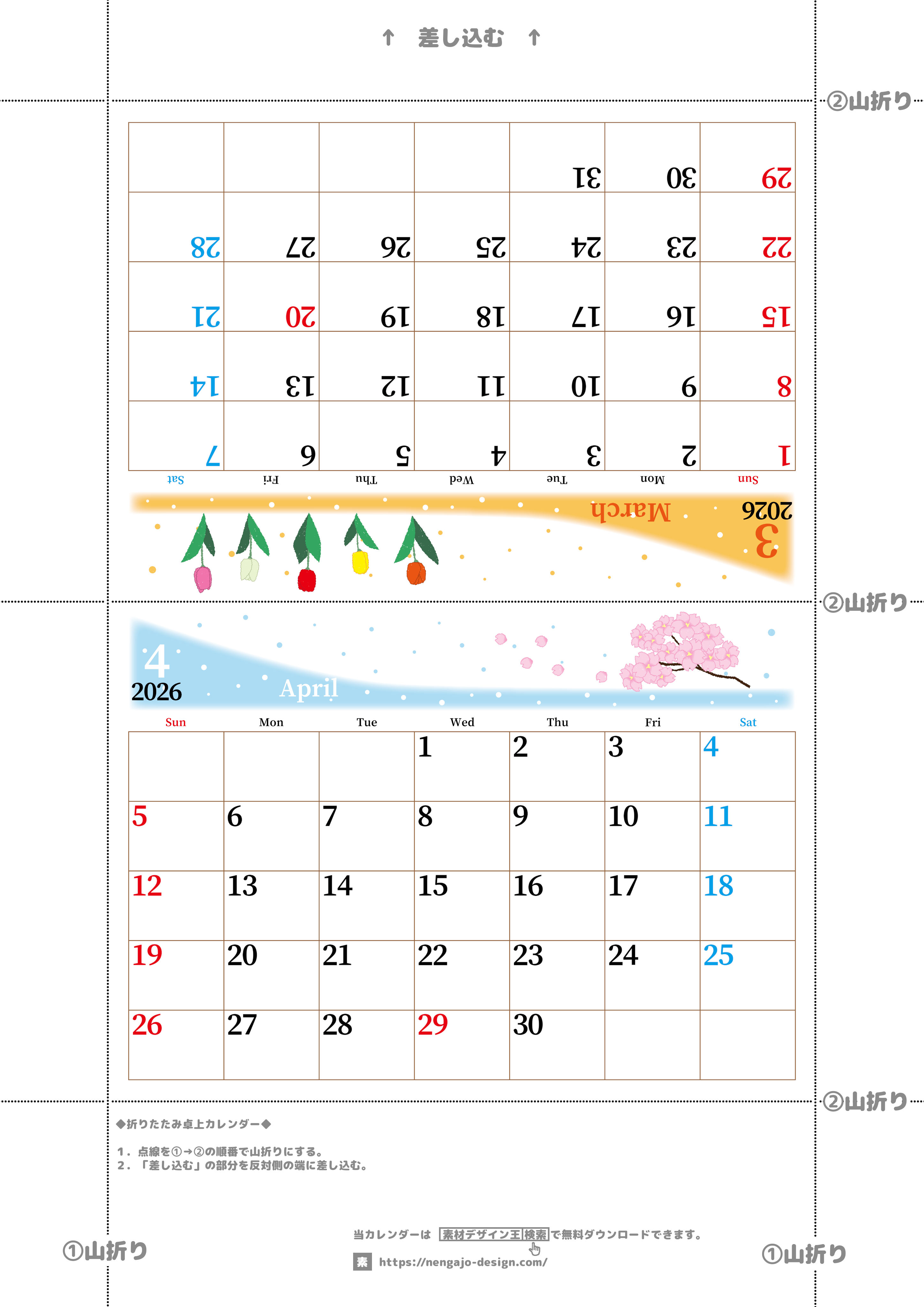 2026年の卓上カレンダー(3月・4月)は日曜始まりです。おしゃれで大きめなので見やすいです。折り方が簡単ですぐに卓上カレンダーとして使えます。無料でダウンロードしてA4用紙にすぐ印刷が行えます。(2026-001303-0430)