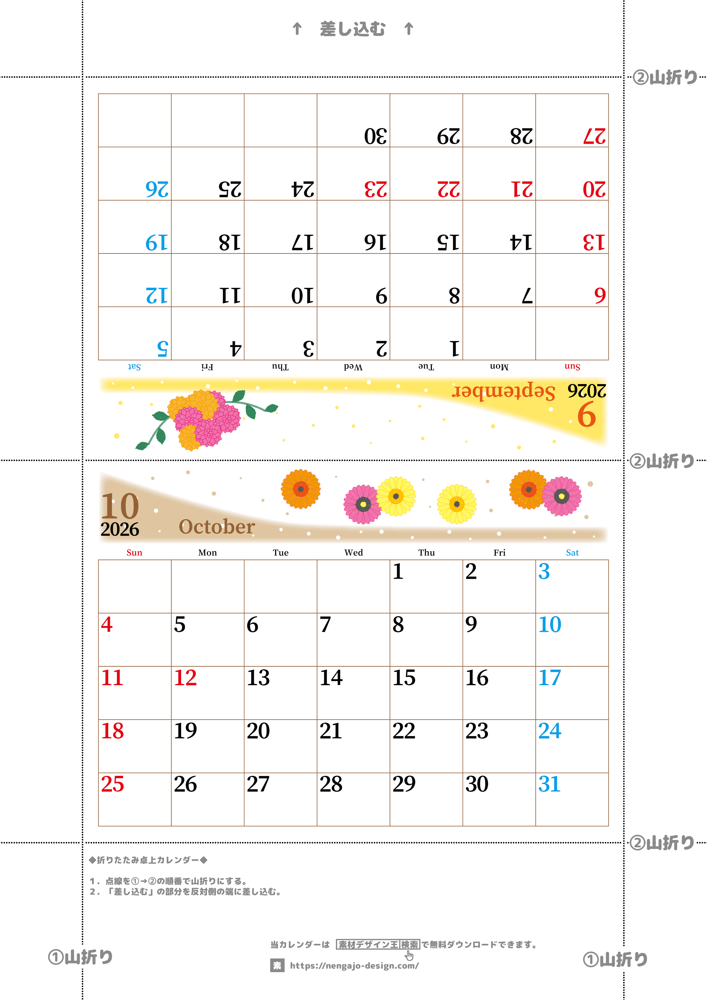 2026年・無料のカレンダーテンプレート 2026年の卓上カレンダー(9月・10月)は日曜始まり♪おしゃれで大きめ♪折り方が簡単で無料(A4)(2026-001309-1030) 素材状デザイン王 2025年4月14日 2026年の卓上カレンダー(9月・10月)は日曜始まりです。おしゃれで大きめなので見やすいです。折り方が簡単ですぐに卓上カレンダーとして使えます。無料でダウンロードしてA4用紙にすぐ印刷が行えます。(2026-001309-1030) おしゃれ カレンダーデザイン-0013 9月 10月 草花 日曜始まり 卓上