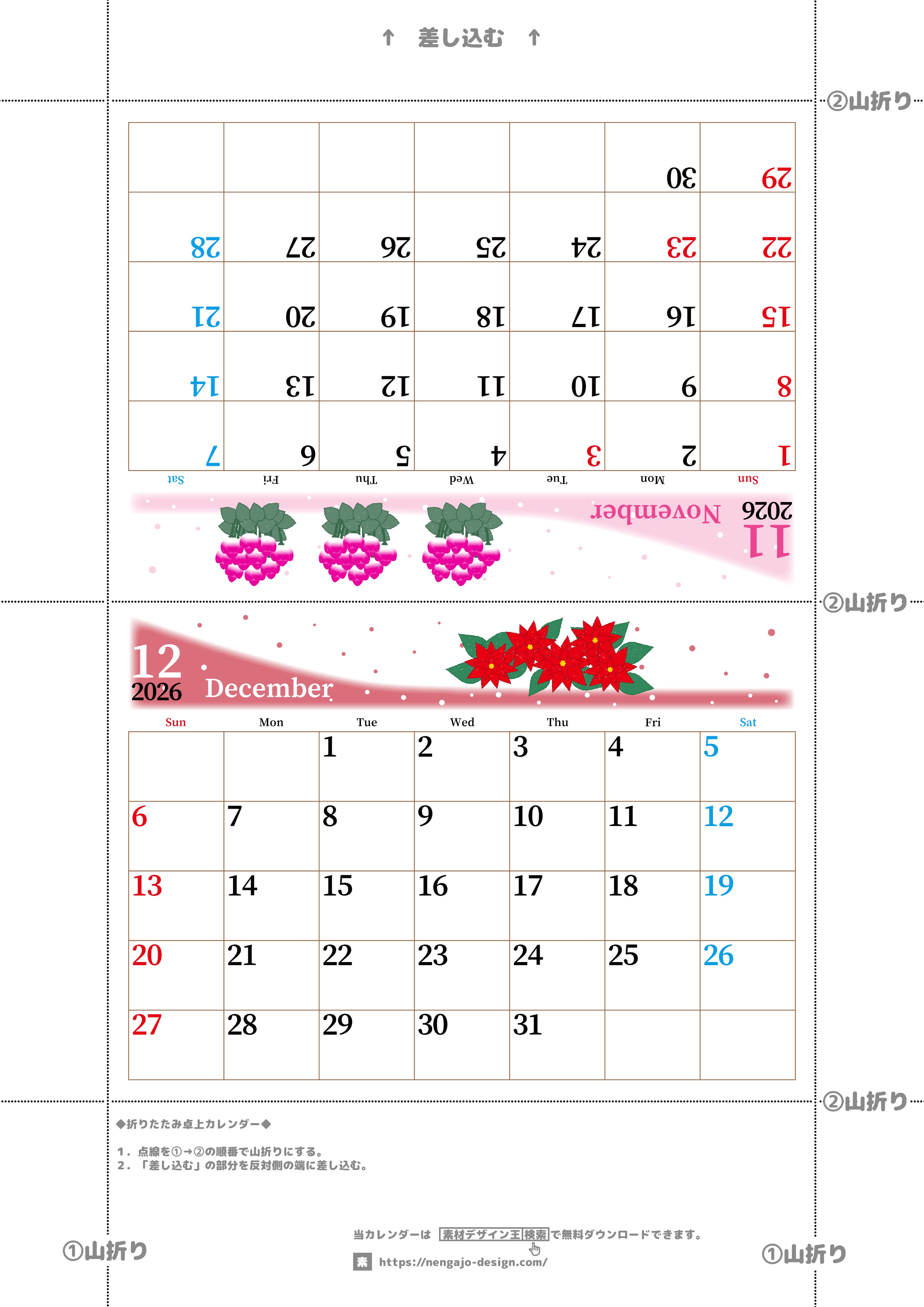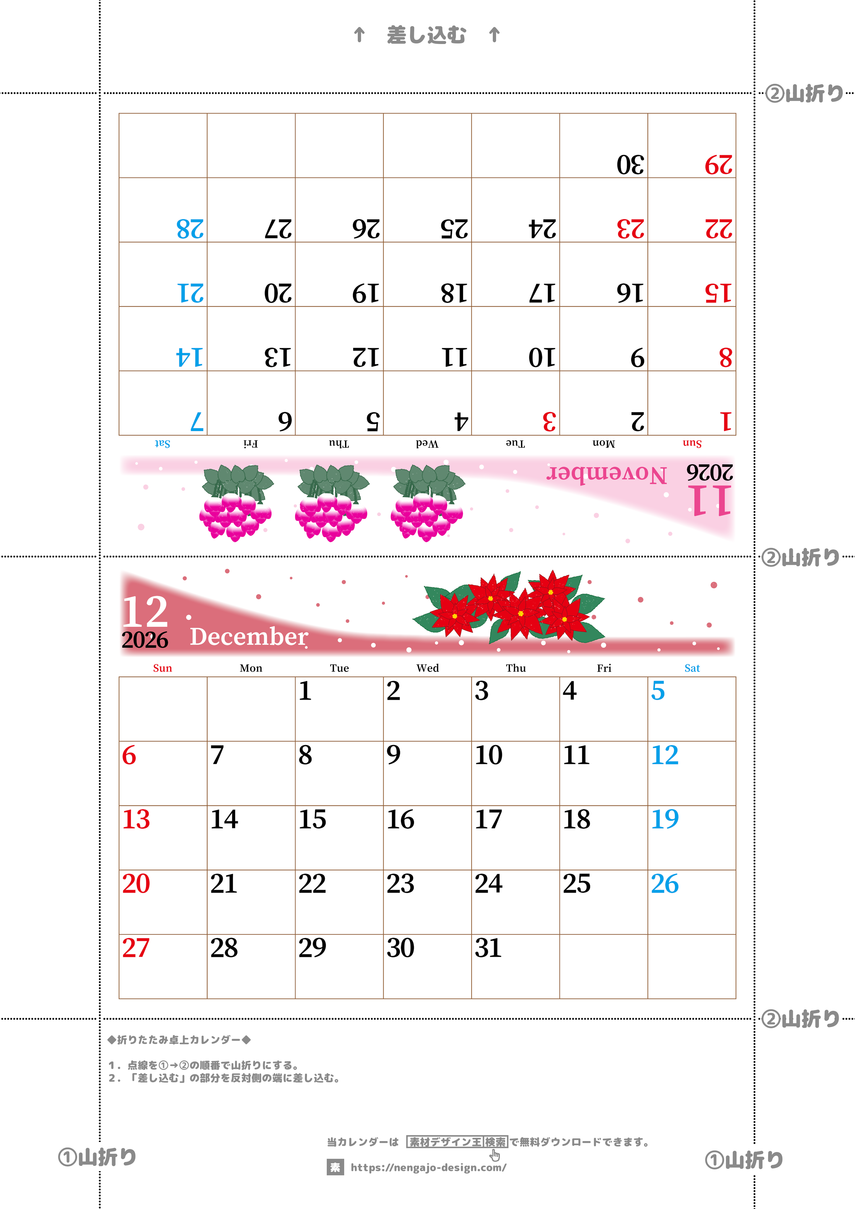 2026年・無料のカレンダーテンプレート 2026年の卓上カレンダー(11月・12月)は日曜始まり♪おしゃれで大きめ♪折り方が簡単で無料(A4)(2026-001311-1230) 素材状デザイン王 2025年4月14日 2026年の卓上カレンダー(11月・12月)は日曜始まりです。おしゃれで大きめなので見やすいです。折り方が簡単ですぐに卓上カレンダーとして使えます。無料でダウンロードしてA4用紙にすぐ印刷が行えます。(2026-001311-1230) おしゃれ カレンダーデザイン-0013 11月 12月 草花 日曜始まり 卓上