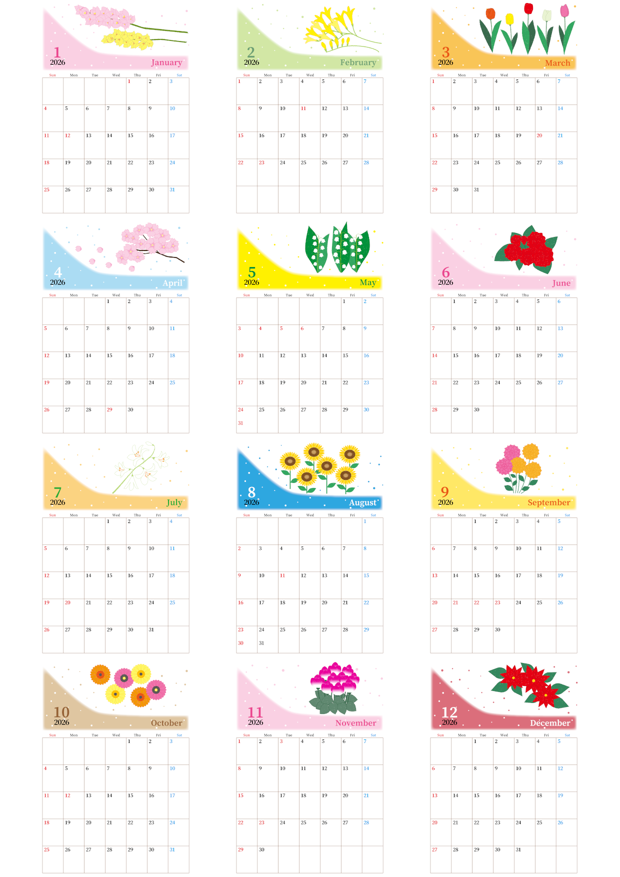 A4縦型・日曜始まりで使える2026年の年間カレンダーです。落ち着いた草花イラストをあしらった穏やかな雰囲気のデザインで、壁に貼った際にも主張しすぎず、空間に自然に溶け込みます。シンプルで見やすいレイアウトで年間の予定を一目で確認でき、家族の予定管理や仕事の年間計画にも役立ちます。書き込みもしやすい構成で、毎日のスケジュール管理が快適になります。無料ダウンロードで印刷してすぐご利用いただけます。
