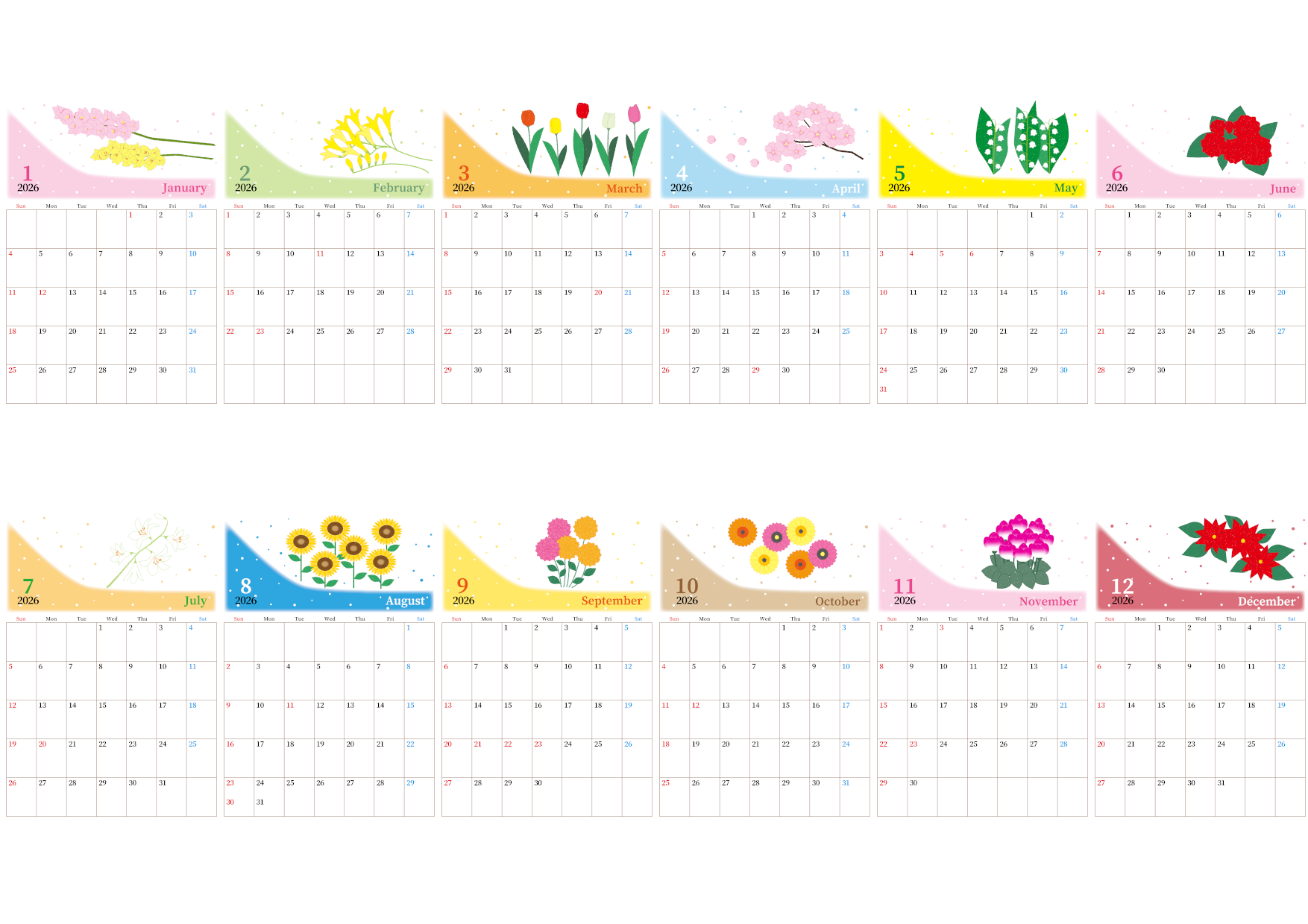 A4縦型・日曜始まりで使える2026年の年間カレンダーです。爽やかで気持ちの良いシンプル構成で、予定が整理しやすくすっきりとした印象にまとまっています。必要な情報だけを整えて表示しているため視認性が高く、家庭用やビジネス用としても役立ちます。書き込みスペースも確保されており、年間の大切なイベントや長期スケジュールの把握に便利。無料ダウンロードで手軽に印刷できます。