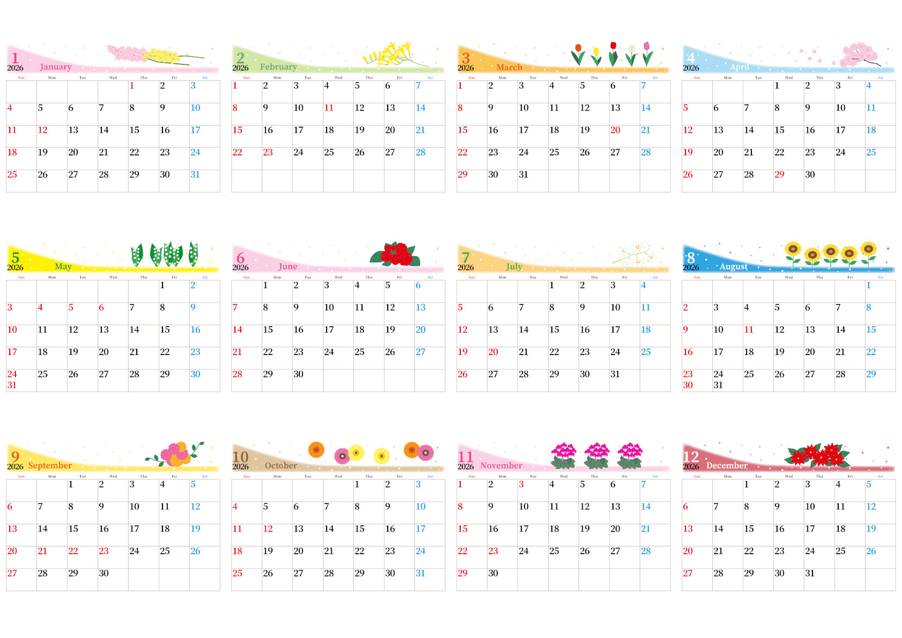 A4一枚で使える2026年の年間カレンダーを無料ダウンロードできます。横向きの日曜始まりで、控えめな草花イラストが上品さを演出します。優しい雰囲気で、家庭でも仕事場でもどんな場所にも合わせやすいデザインです。年間のスケジュールをまとめやすく、機能性と上質感を両立したカレンダーです。