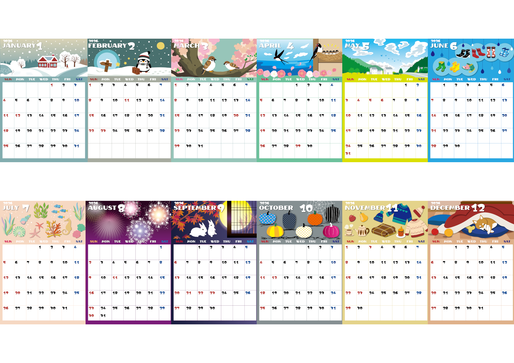 A4縦型・日曜始まりの年間カレンダーです。カラフルで明るいデザインが魅力で、見るだけで気分が晴れる楽しい雰囲気。予定を書き込むスペースもしっかり確保されており、整理しやすいシンプル構成。家庭用、学生用、ビジネス用として幅広く活躍します。印刷してすぐに使える無料ダウンロード素材です。