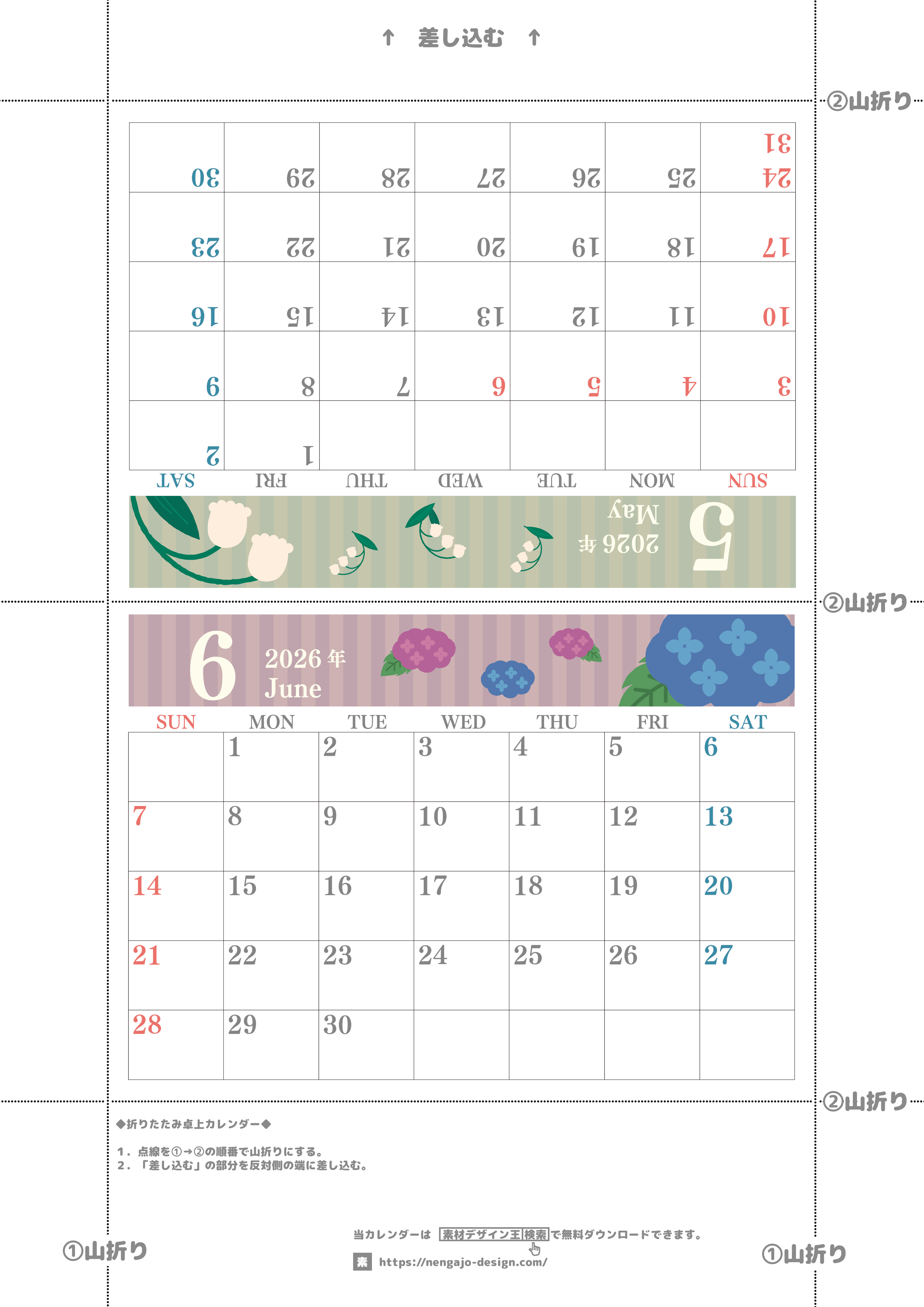 2026年の卓上カレンダー(5月・6月)は日曜始まりです。かわいいデザインで文字も大きめなので家族でも使えます。オリジナルのイラストつきでスケジュール管理が楽しく出来ます。ダウンロード無料でサイズはA4です。(2026-001505-0630)