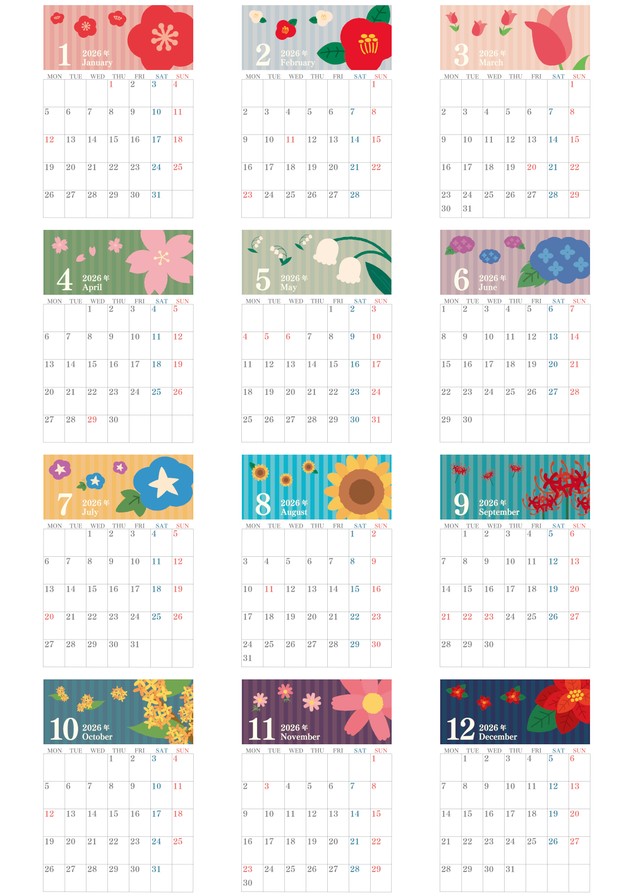 A4縦型・月曜始まりで使える年間カレンダーです。上品で華やかな花イラストが魅力で、空間を明るくしてくれる美しいデザイン。年間のスケジュールをひと目で確認できるため、計画の整理にも便利です。家庭・職場のどちらでも活躍する実用カレンダー。無料ダウンロードが可能です。