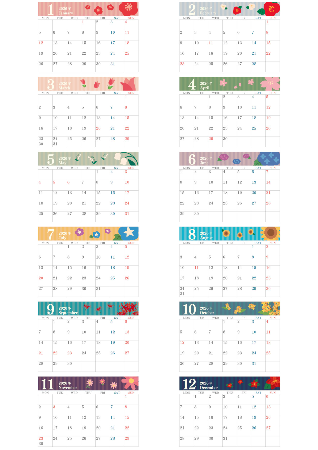 2026年の年間カレンダーはA4横型の月曜始まり♪上品な花イラストがやさしく彩る!無料ダウンロード可能!