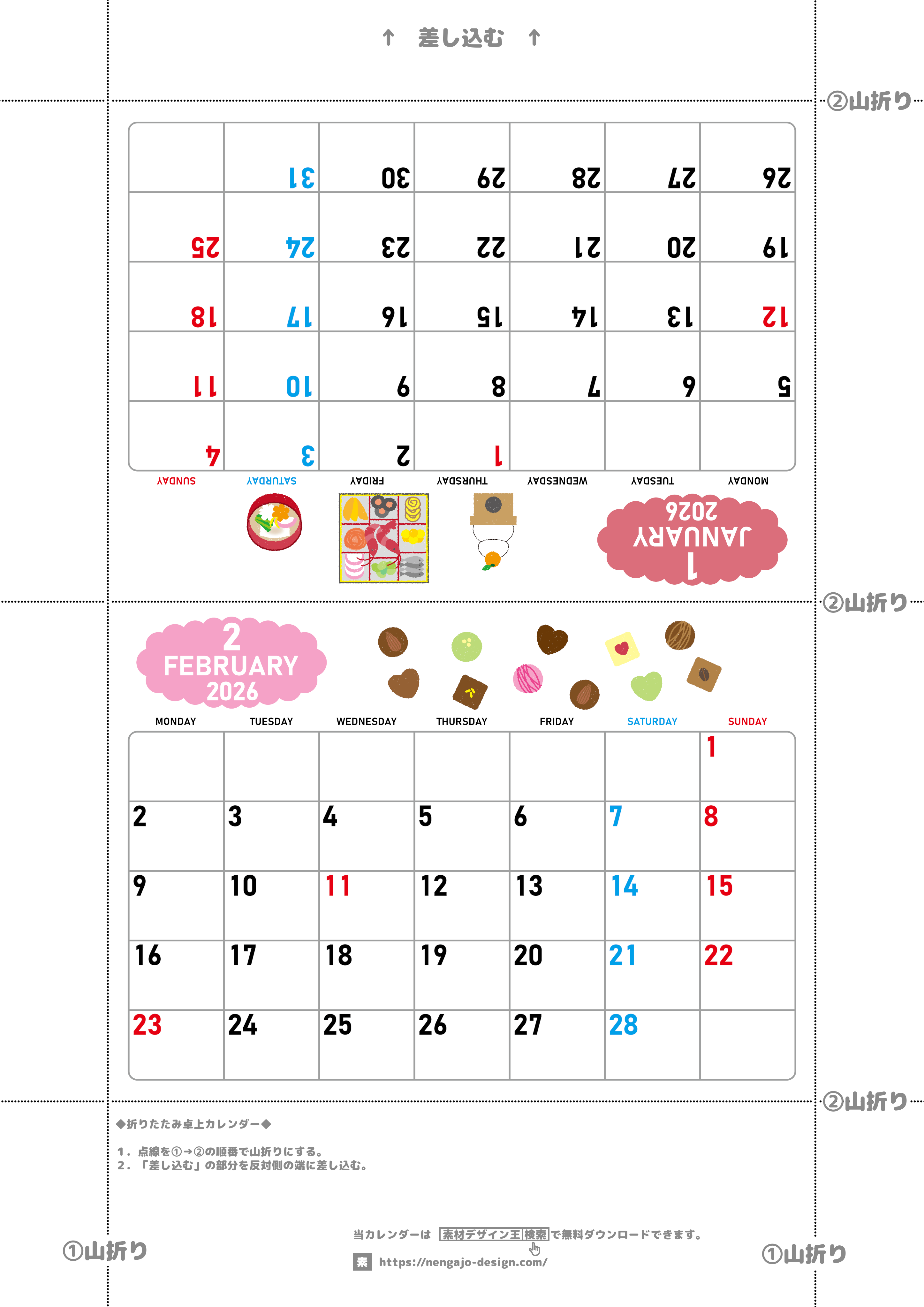 2026年の卓上カレンダー(1月・2月)は月曜始まり♪ポップな家族でも使えるオリジナルイラストつき:ダウンロード無料(2026-001601-0231)