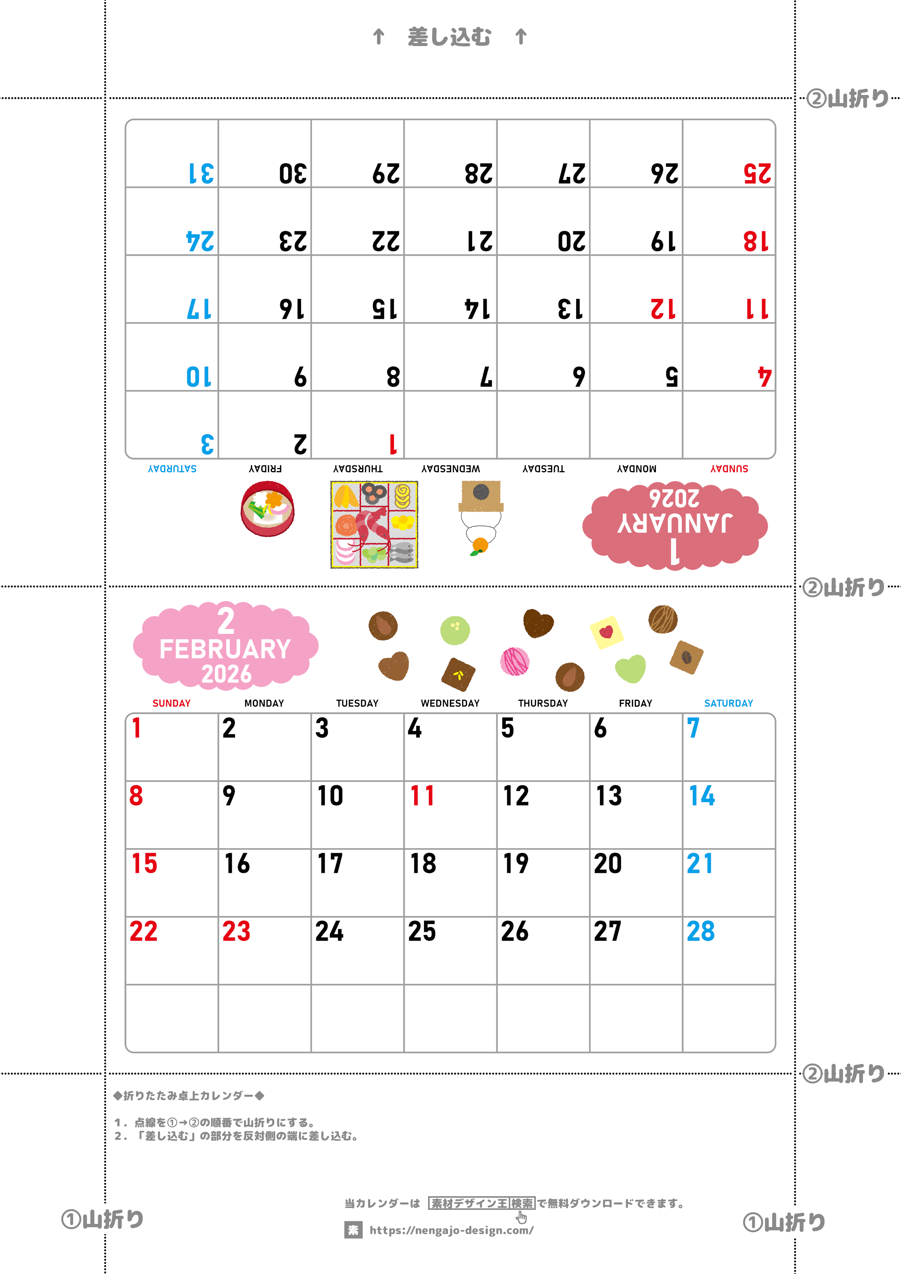 2026年・無料のカレンダーテンプレート 2026年の卓上カレンダー(1月・2月)は日曜始まり♪ポップな家族でも使えるオリジナルイラストつき:ダウンロード無料(2026-001601-0230) 素材状デザイン王 2025年4月14日 2026年の卓上カレンダー(1月・2月)は日曜始まりです。ポップなデザインで文字も大きめなので家族でも使えます。オリジナルのイラストつきでスケジュール管理が楽しく出来ます。ダウンロード無料でサイズはA4です。(2026-001601-0230) ポップ カレンダーデザイン-0016 1月 2月 季節 日曜始まり 卓上