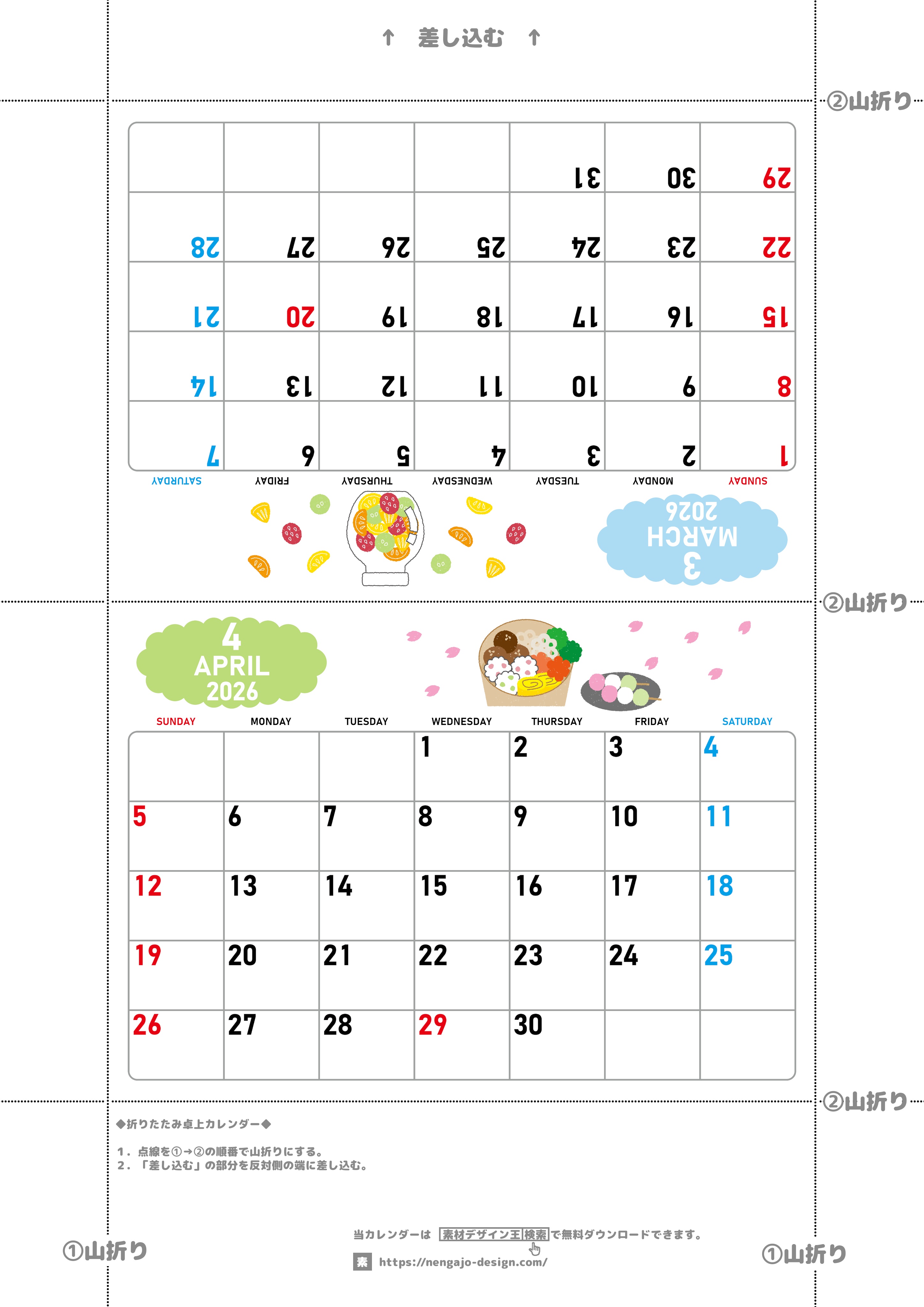 2026年・無料のカレンダーテンプレート 2026年の卓上カレンダー(3月・4月)は日曜始まり♪ポップな家族でも使えるオリジナルイラストつき:ダウンロード無料(2026-001603-0430) 素材状デザイン王 2025年4月14日 2026年の卓上カレンダー(3月・4月)は日曜始まりです。ポップなデザインで文字も大きめなので家族でも使えます。オリジナルのイラストつきでスケジュール管理が楽しく出来ます。ダウンロード無料でサイズはA4です。(2026-001603-0430) ポップ カレンダーデザイン-0016 3月 4月 季節 日曜始まり 卓上
