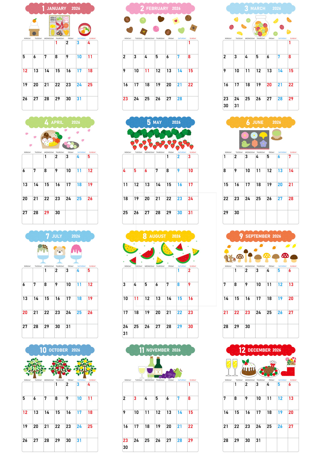 年間カレンダー2026はA4縦型の月曜始まり♪ポップな色使いで気分が明るくなるデザイン!無料ダウンロード可能!
