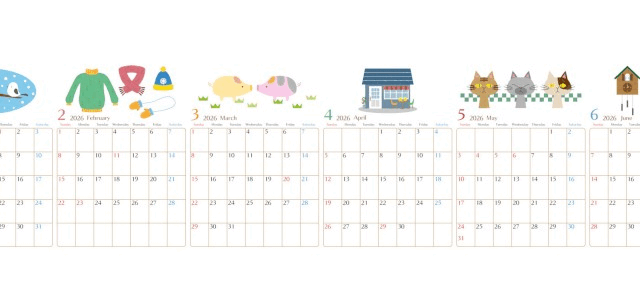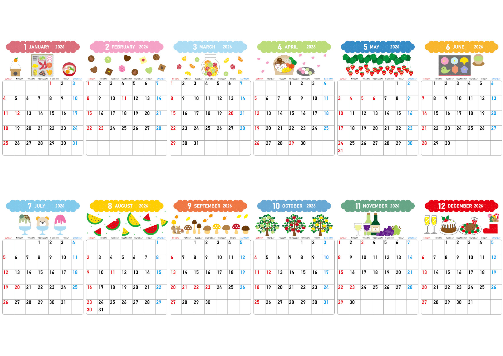 A4縦型で使える2026年の年間カレンダーを無料ダウンロードできます。日曜始まりで、明るいカラーとシンプルな構成がバランスよくまとまっています。予定を書き込んでも見やすさを損なわず、家庭の壁掛けにも職場のスケジュール表としても使いやすいデザインです。毎日の管理が快適になるフリー素材です。
