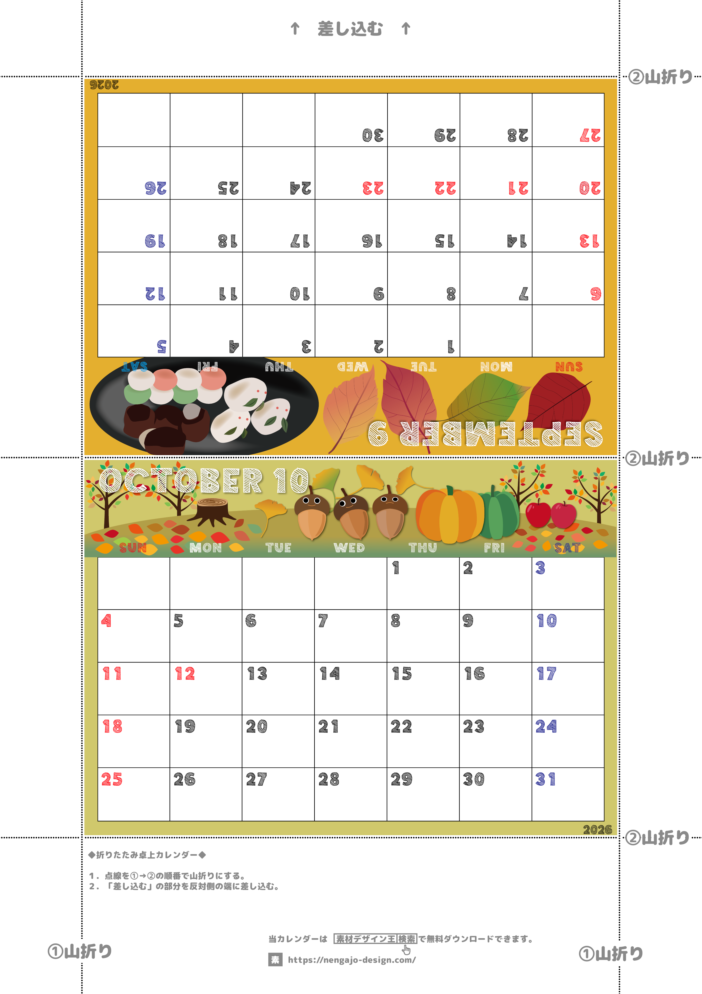 2026年の卓上カレンダー(9月・10月)は日曜始まりです。おしゃれなデザインで文字も大きめなので家族でも使えます。オリジナルのイラストつきでスケジュール管理が楽しく出来ます。ダウンロード無料でサイズはA4です。(2026-001709-1030)