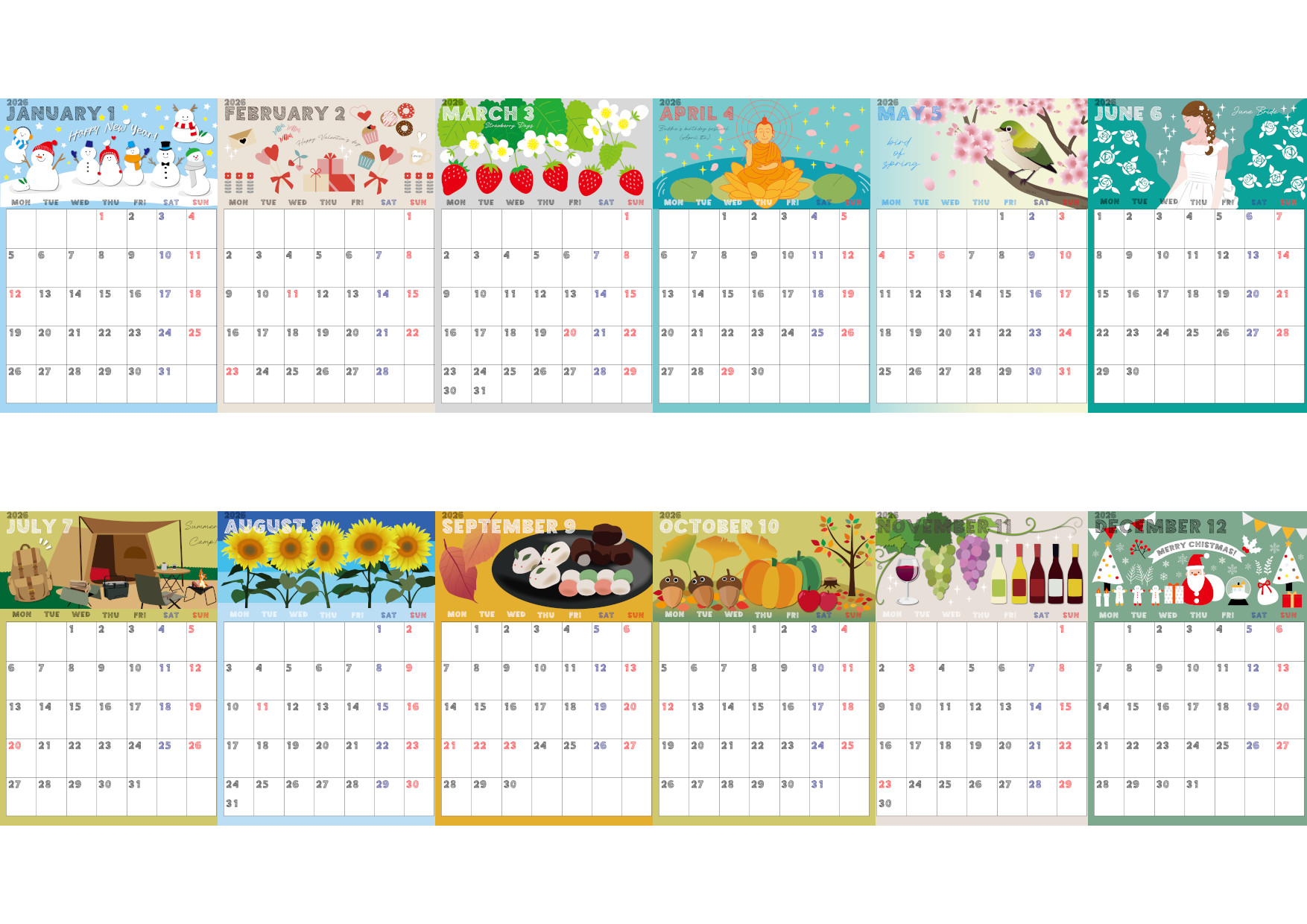 2026年版年間カレンダーを無料ダウンロードできます。A4縦型の月曜始まりで、鮮やかなカラーが印象的なデザインです。壁に貼っても視認性が高く、一年を見渡しながら計画が立てられます。明るく前向きに過ごしたい方におすすめのフリー素材です。
