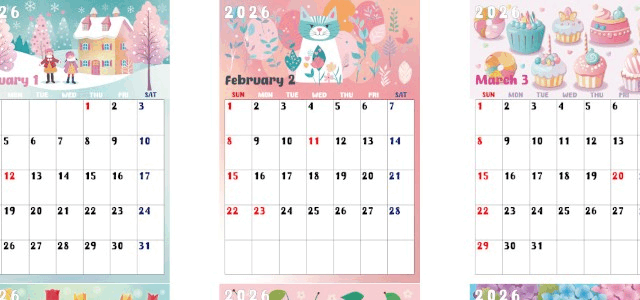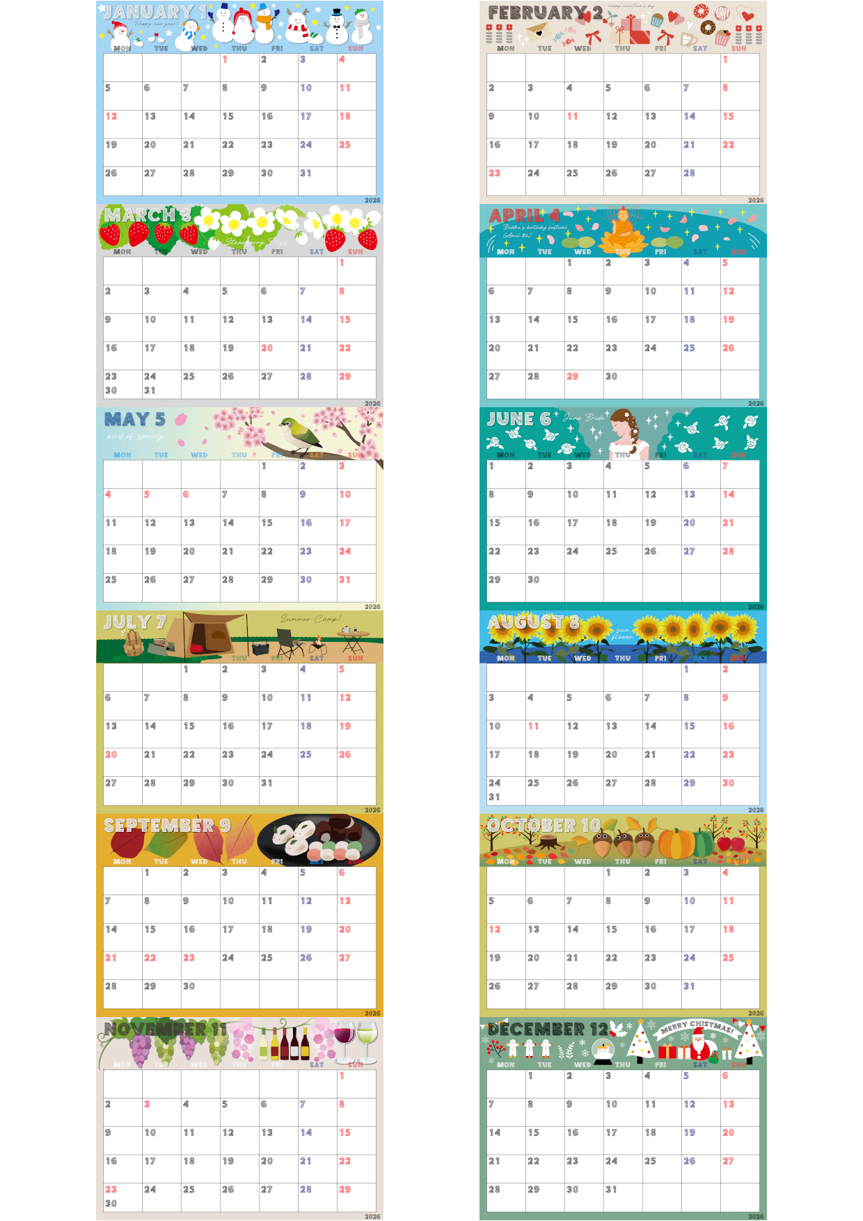 2026年の年間カレンダーを無料ダウンロードできます。A4横型の月曜始まりで、フリー素材としても使いやすい鮮やかなデザインです。色合いのバランスが良く、予定確認がスムーズに進む構成となっています。長期イベントや行事の整理にも便利で、使いやすさにこだわった年間カレンダーです。