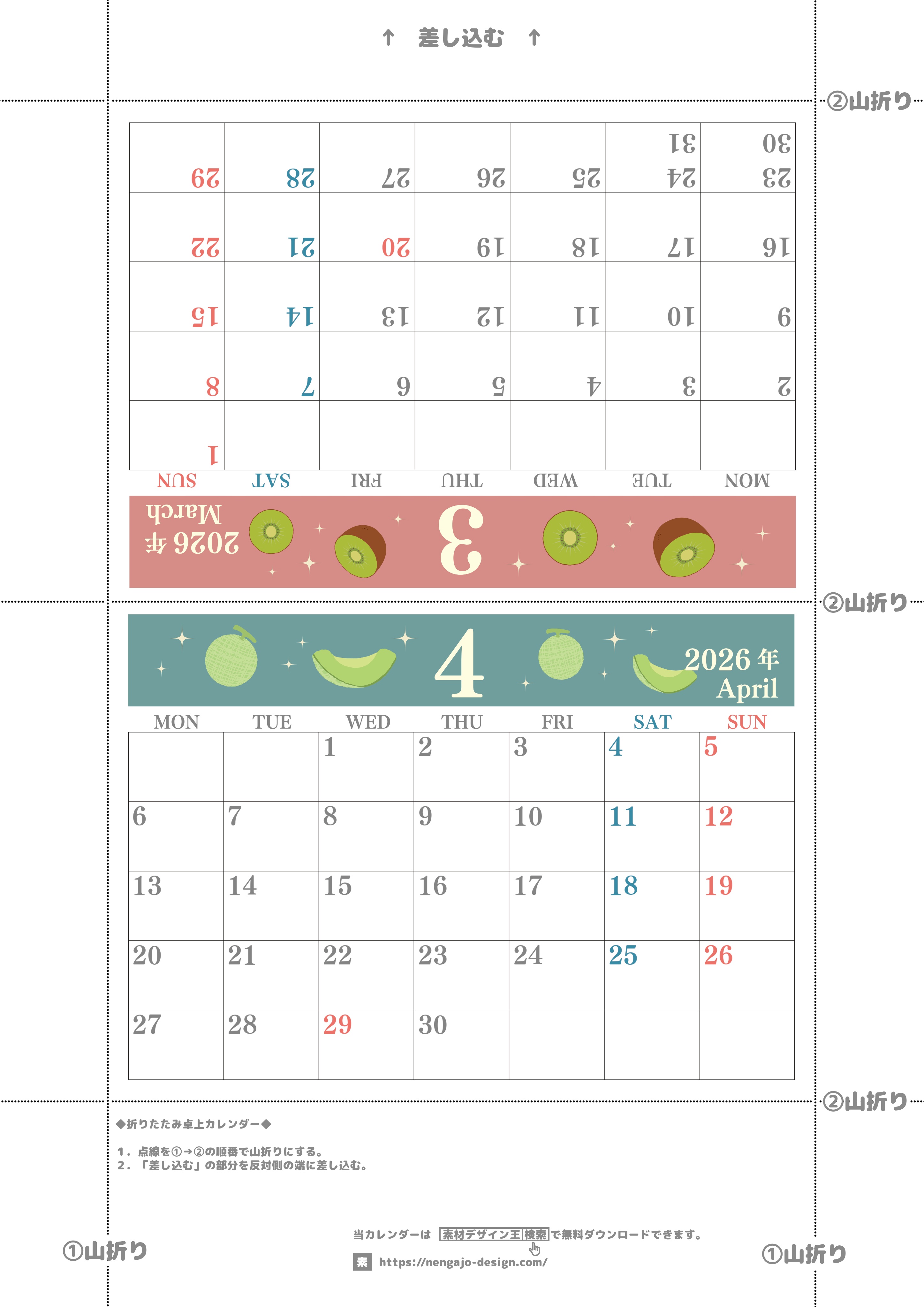 2026年・無料のカレンダーテンプレート 2026年の卓上カレンダー(3月・4月)は月曜始まり♪かわいいだけでなく使い方も簡単♪A4サイズ/プリント無料(2026-001803-0431) 素材状デザイン王 2025年4月14日 2026年の卓上カレンダー(3月・4月)は月曜始まり♪かわいいだけでなく使い方も簡単♪A4サイズ/プリント無料(2026-001803-0431) かわいい カレンダーデザイン-0018 3月 4月 果物 月曜始まり 卓上