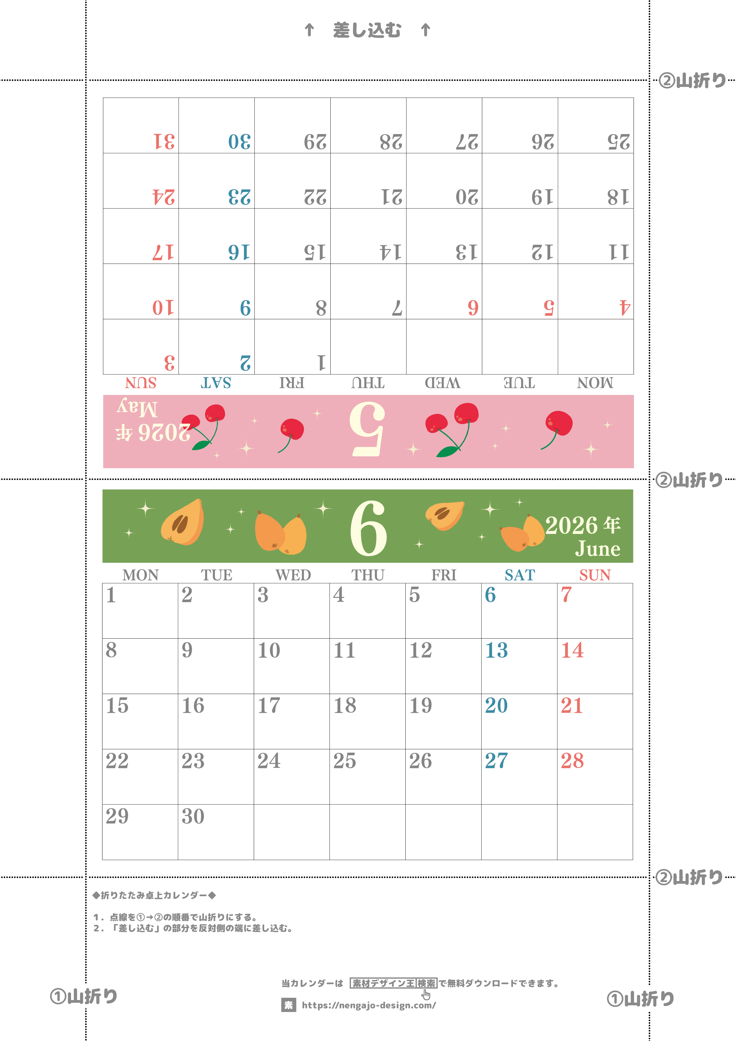2026年・無料のカレンダーテンプレート 2026年の卓上カレンダー(5月・6月)は月曜始まり♪かわいいだけでなく使い方も簡単♪A4サイズ/プリント無料(2026-001805-0631) 素材状デザイン王 2025年4月14日 2026年の卓上カレンダー(5月・6月)は月曜始まり♪かわいいだけでなく使い方も簡単♪A4サイズ/プリント無料(2026-001805-0631) かわいい カレンダーデザイン-0018 5月 6月 果物 月曜始まり 卓上
