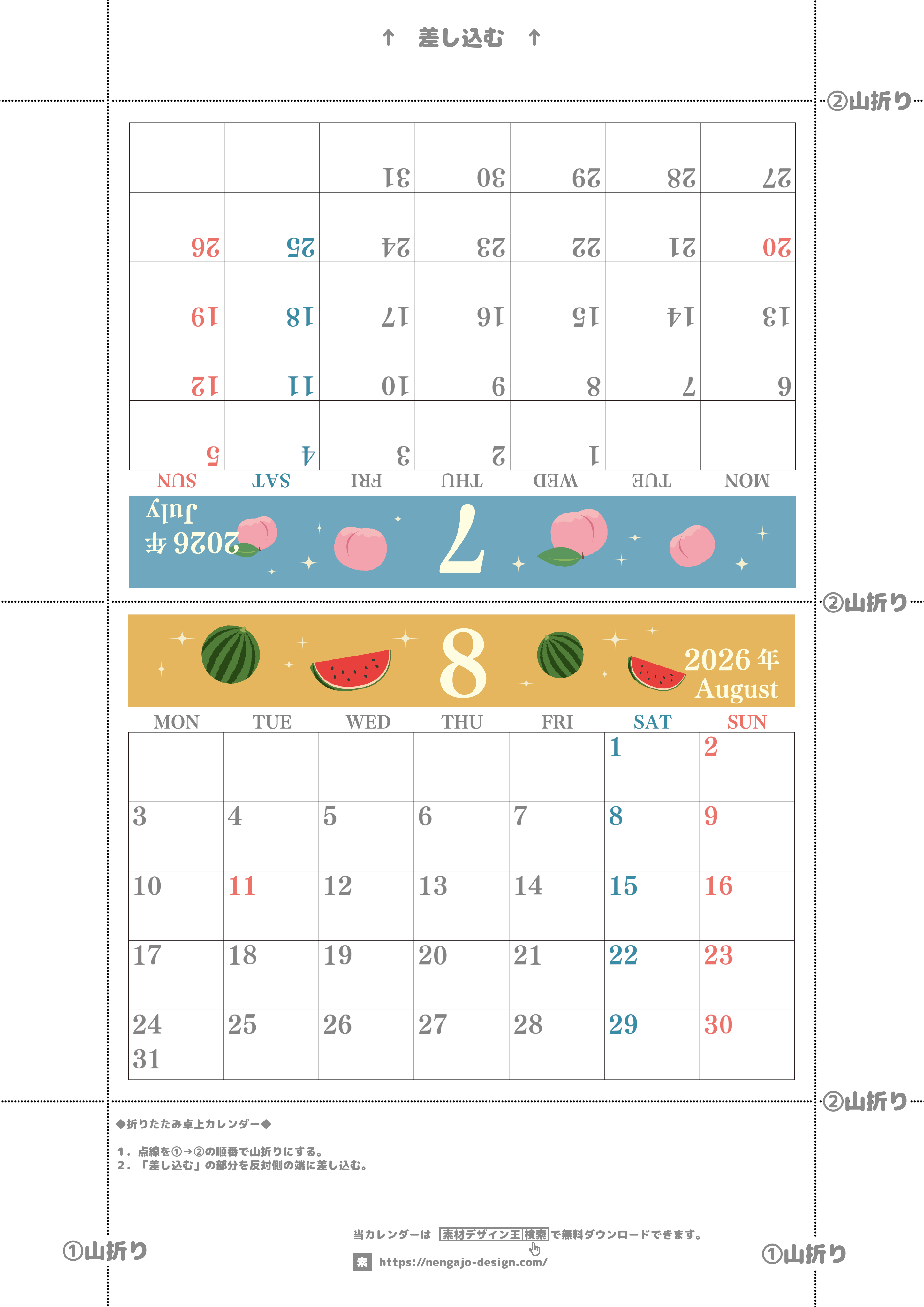 2026年・無料のカレンダーテンプレート 2026年の卓上カレンダー(7月・8月)は月曜始まり♪かわいいだけでなく使い方も簡単♪A4サイズ/プリント無料(2026-001807-0831) 素材状デザイン王 2025年4月14日 2026年の卓上カレンダー(7月・8月)は月曜始まり♪かわいいだけでなく使い方も簡単♪A4サイズ/プリント無料(2026-001807-0831) かわいい カレンダーデザイン-0018 7月 8月 果物 月曜始まり 卓上
