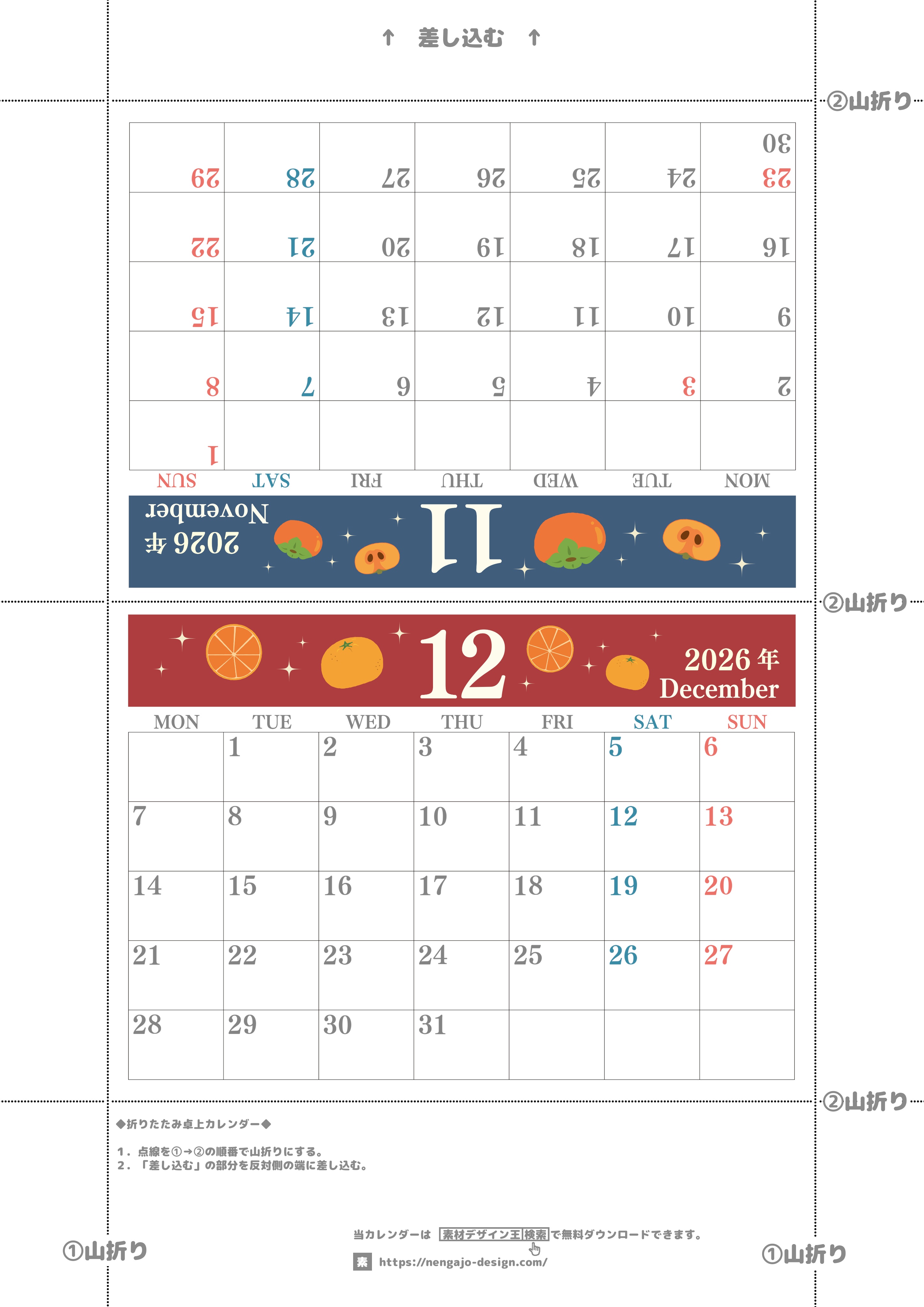 2026年・無料のカレンダーテンプレート 2026年の卓上カレンダー(11月・12月)は月曜始まり♪かわいいだけでなく使い方も簡単♪A4サイズ/プリント無料(2026-001811-1231) 素材状デザイン王 2025年4月14日 2026年の卓上カレンダー(11月・12月)は月曜始まり♪かわいいだけでなく使い方も簡単♪A4サイズ/プリント無料(2026-001811-1231) かわいい カレンダーデザイン-0018 11月 12月 果物 月曜始まり 卓上