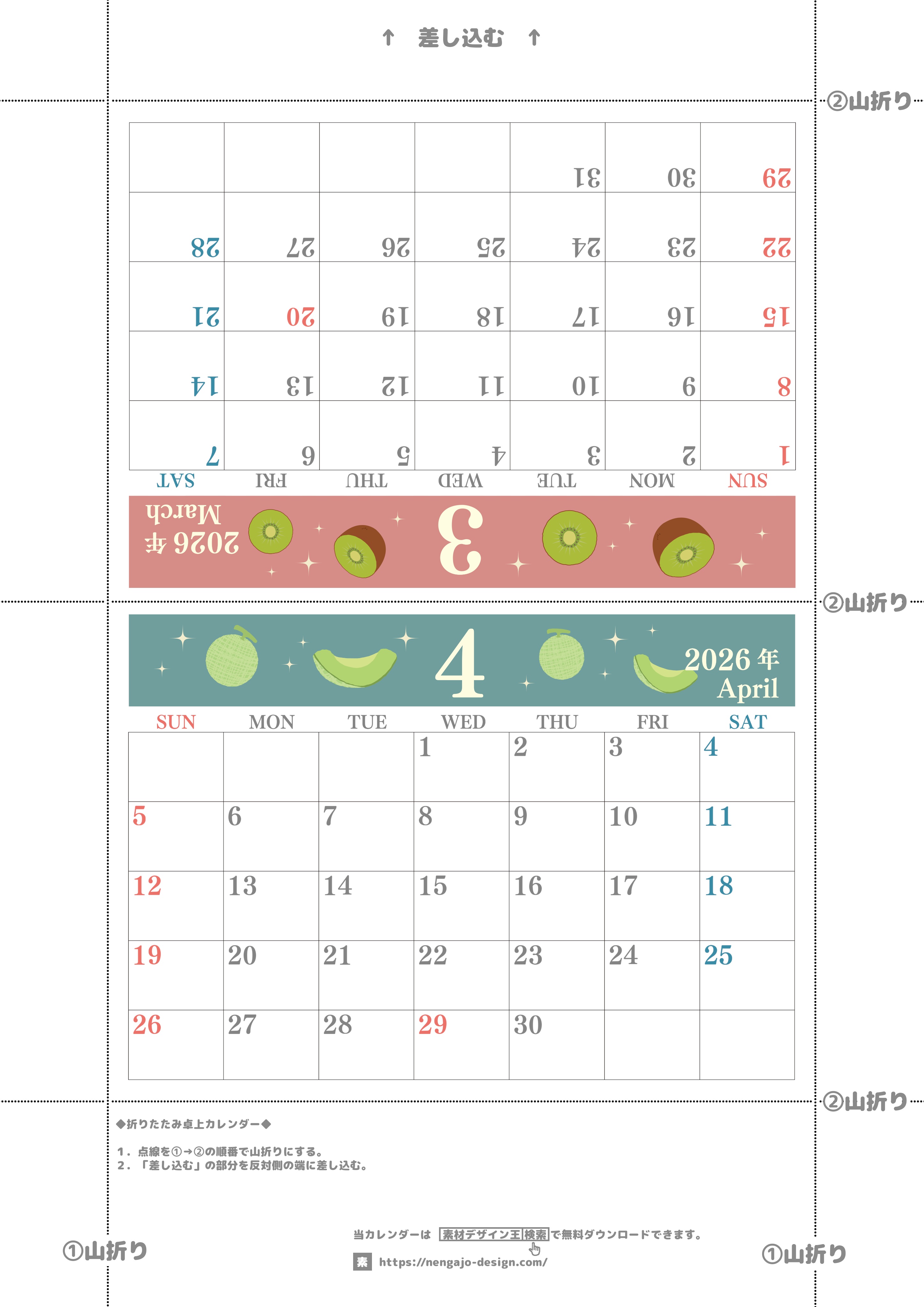 2026年・無料のカレンダーテンプレート 2026年の卓上カレンダー(3月・4月)は日曜始まり♪かわいいだけでなく使い方も簡単♪A4サイズ/プリント無料(2026-001803-0430) 素材状デザイン王 2025年4月14日 2026年の卓上カレンダー(3月・4月)は日曜始まりです。かわいいだけでなく使い方も簡単なちょうどいいA4サイズなのでプリントアウトして折りたたむだけです。ダウンロードは無料ですぐです。(2026-001803-0430) かわいい カレンダーデザイン-0018 3月 4月 果物 日曜始まり 卓上