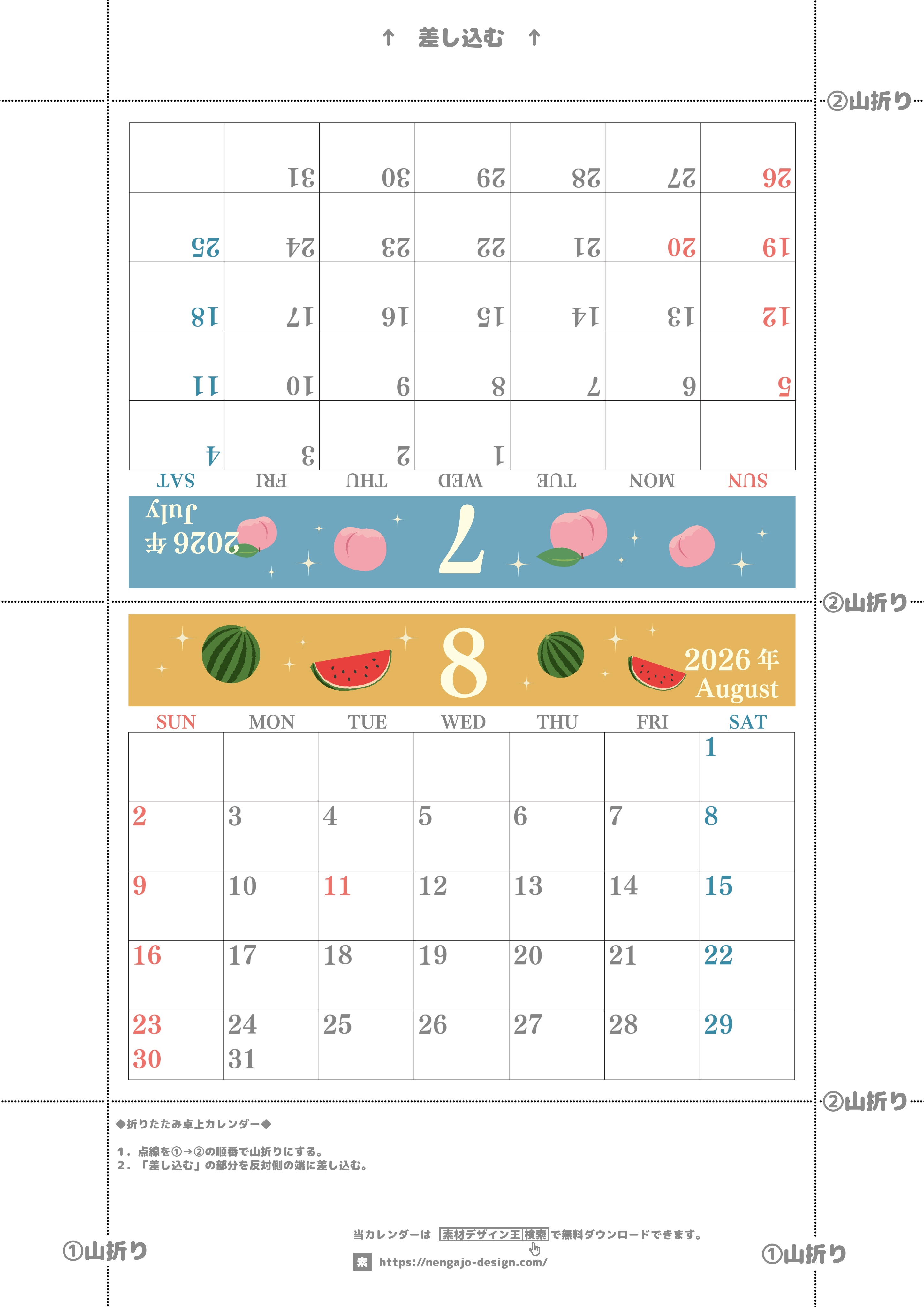 2026年の卓上カレンダー(7月・8月)は日曜始まりです。かわいいだけでなく使い方も簡単なちょうどいいA4サイズなのでプリントアウトして折りたたむだけです。ダウンロードは無料ですぐです。(2026-001807-0830)