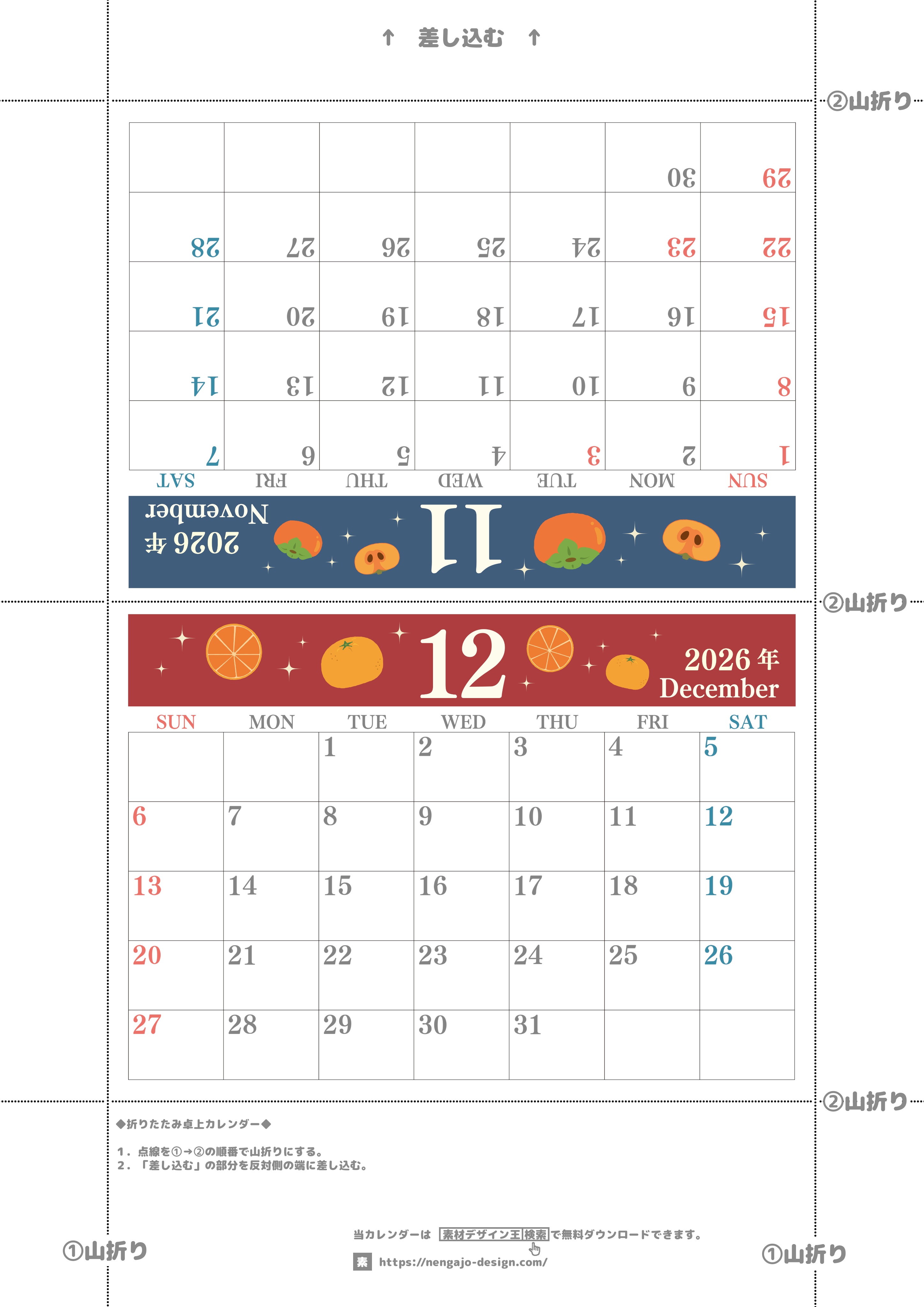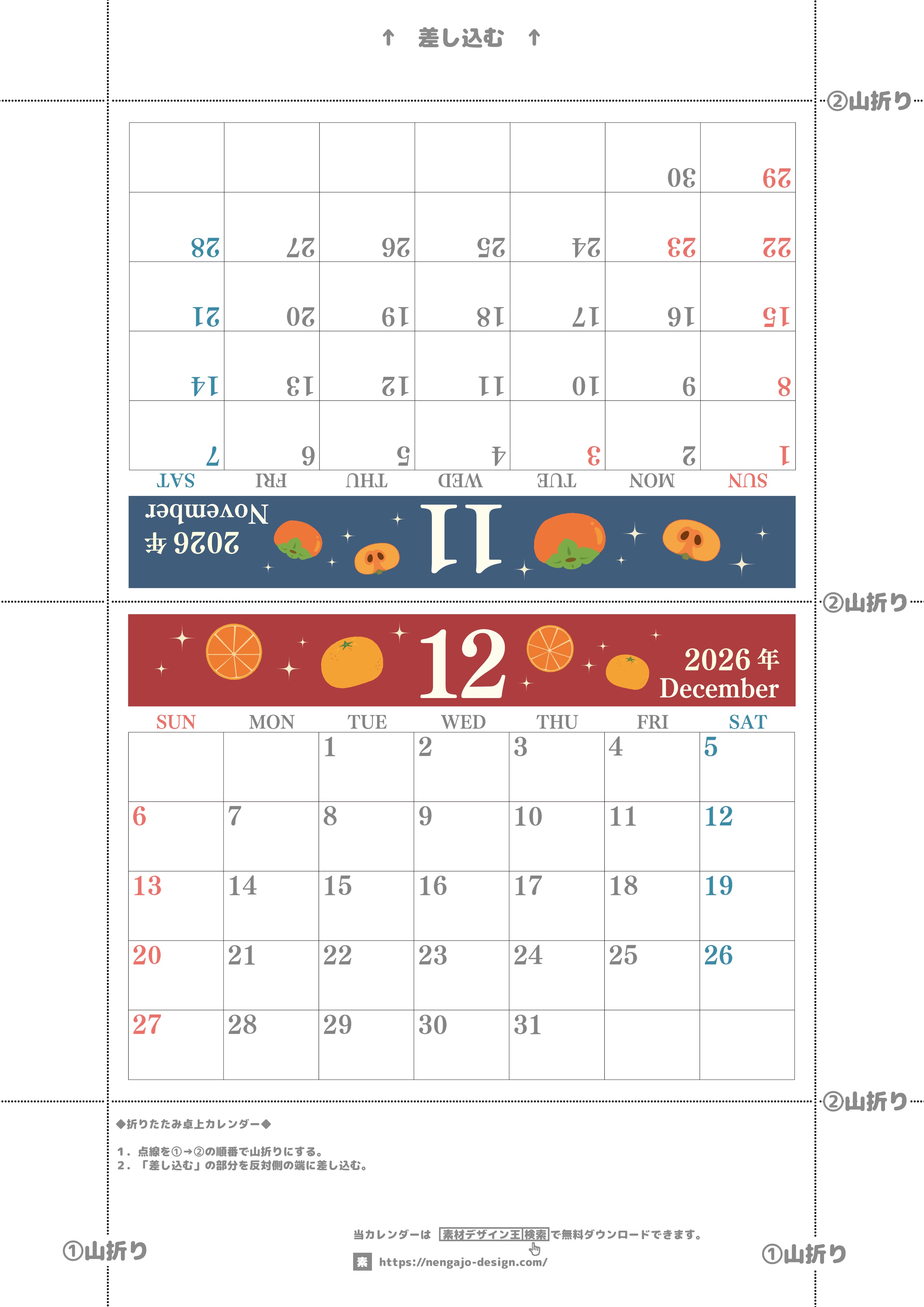 2026年・無料のカレンダーテンプレート 2026年の卓上カレンダー(11月・12月)は日曜始まり♪かわいいだけでなく使い方も簡単♪A4サイズ/プリント無料(2026-001811-1230) 素材状デザイン王 2025年4月14日 2026年の卓上カレンダー(11月・12月)は日曜始まりです。かわいいだけでなく使い方も簡単なちょうどいいA4サイズなのでプリントアウトして折りたたむだけです。ダウンロードは無料ですぐです。(2026-001811-1230) かわいい カレンダーデザイン-0018 11月 12月 果物 日曜始まり 卓上