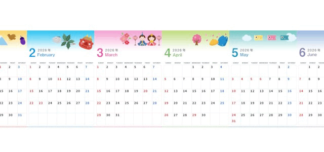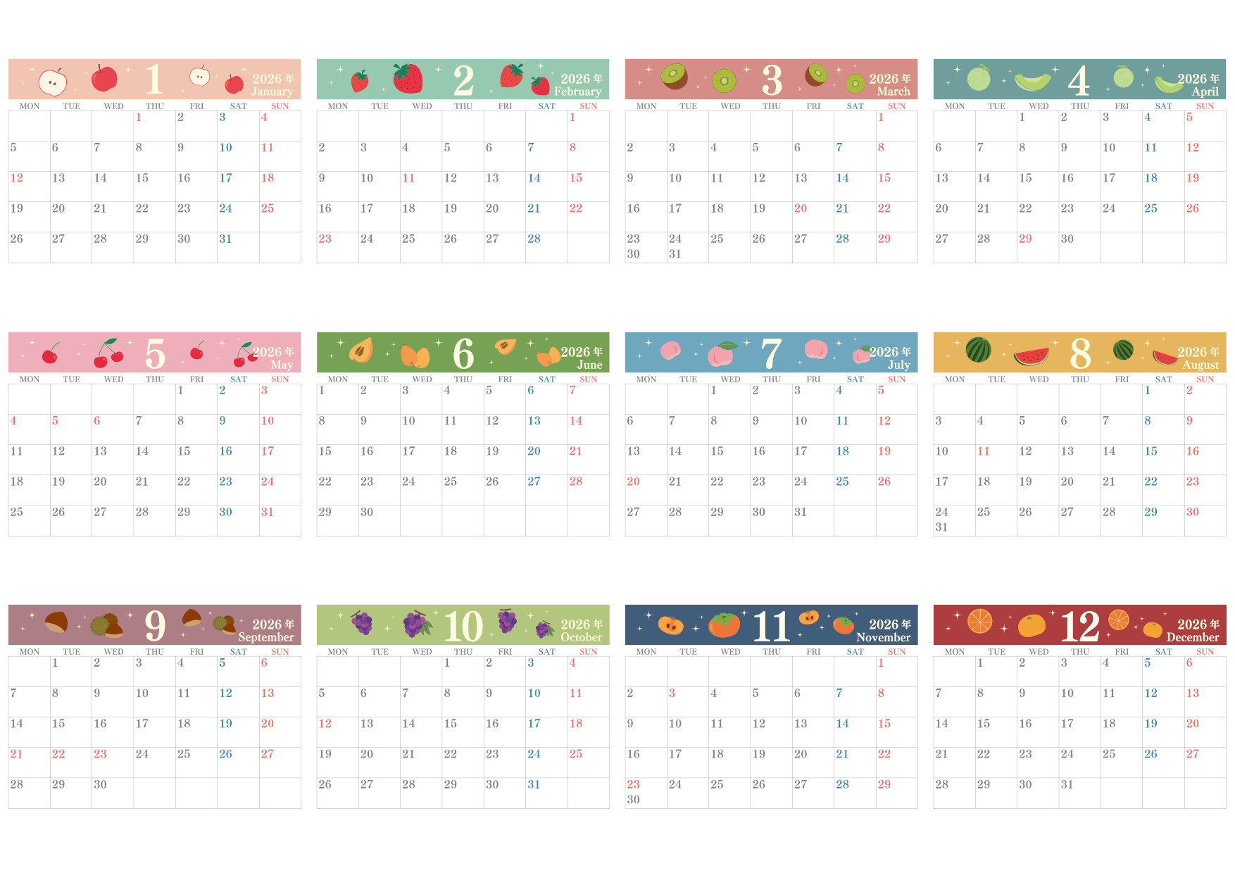 2026年間カレンダーを無料ダウンロードできます。A4横型の月曜始まりで、毎日見るのが楽しみになるフルーツイラストが特徴です。視認性の高いレイアウトで、予定や行事を書き込んでも整理しやすく、長く使い続けられる実用的なデザインです。家庭や職場で気軽に活用できる便利なフリー素材です。