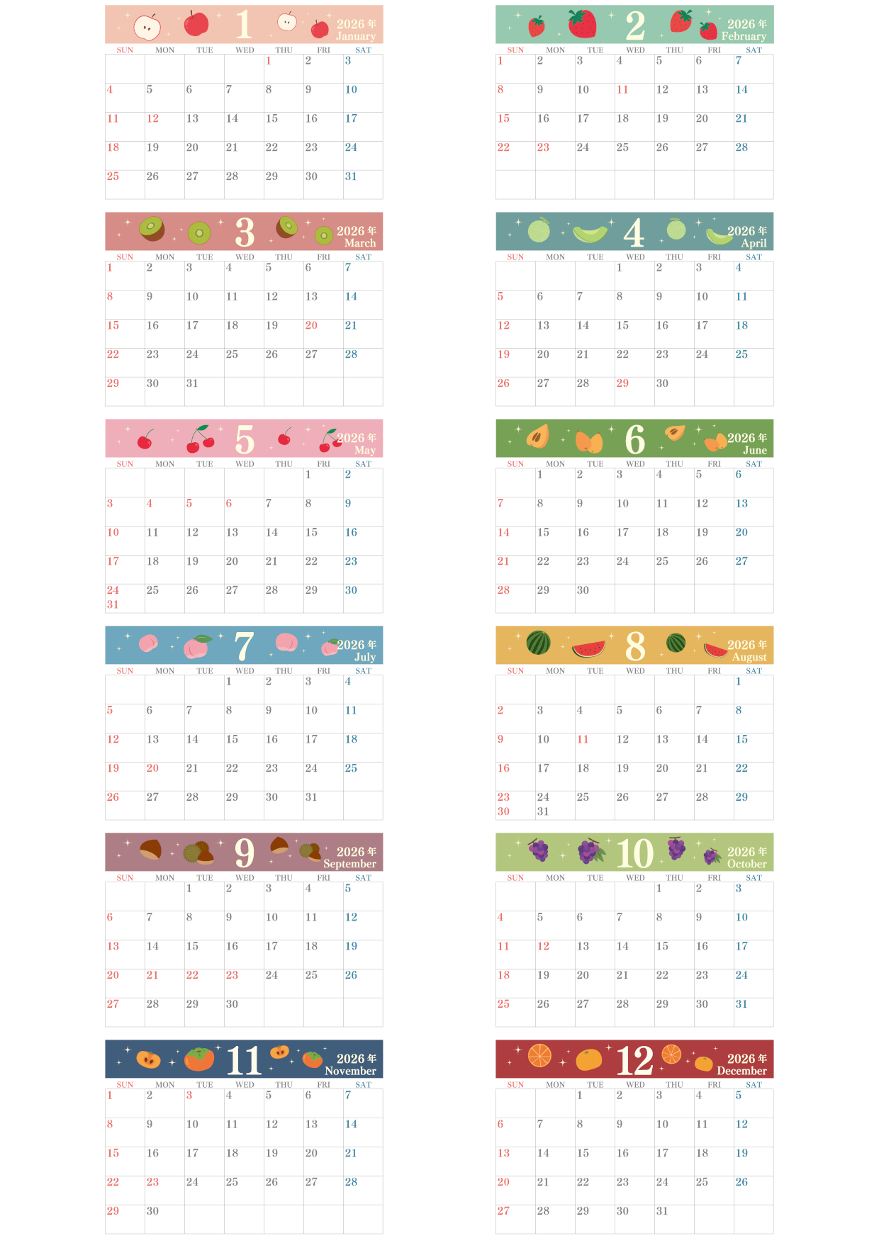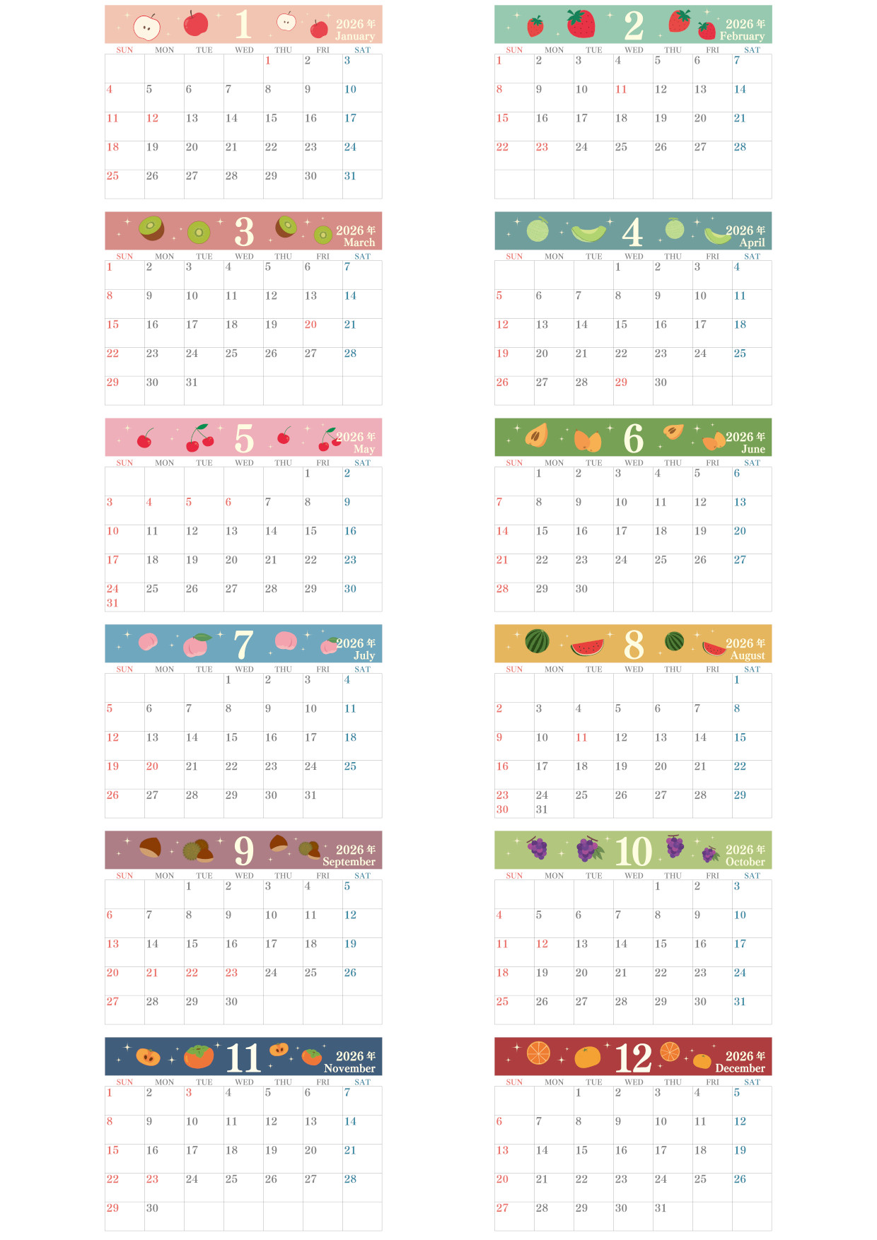 2026年間カレンダーを無料ダウンロードできます。A4横型の日曜始まりで、季節のフルーツがかわいく描かれたデザインです。春のいちごや夏のスイカなど、季節を感じながら予定管理ができます。家庭や学校、子ども部屋に貼っても楽しい雰囲気になる、明るい年間カレンダーです。