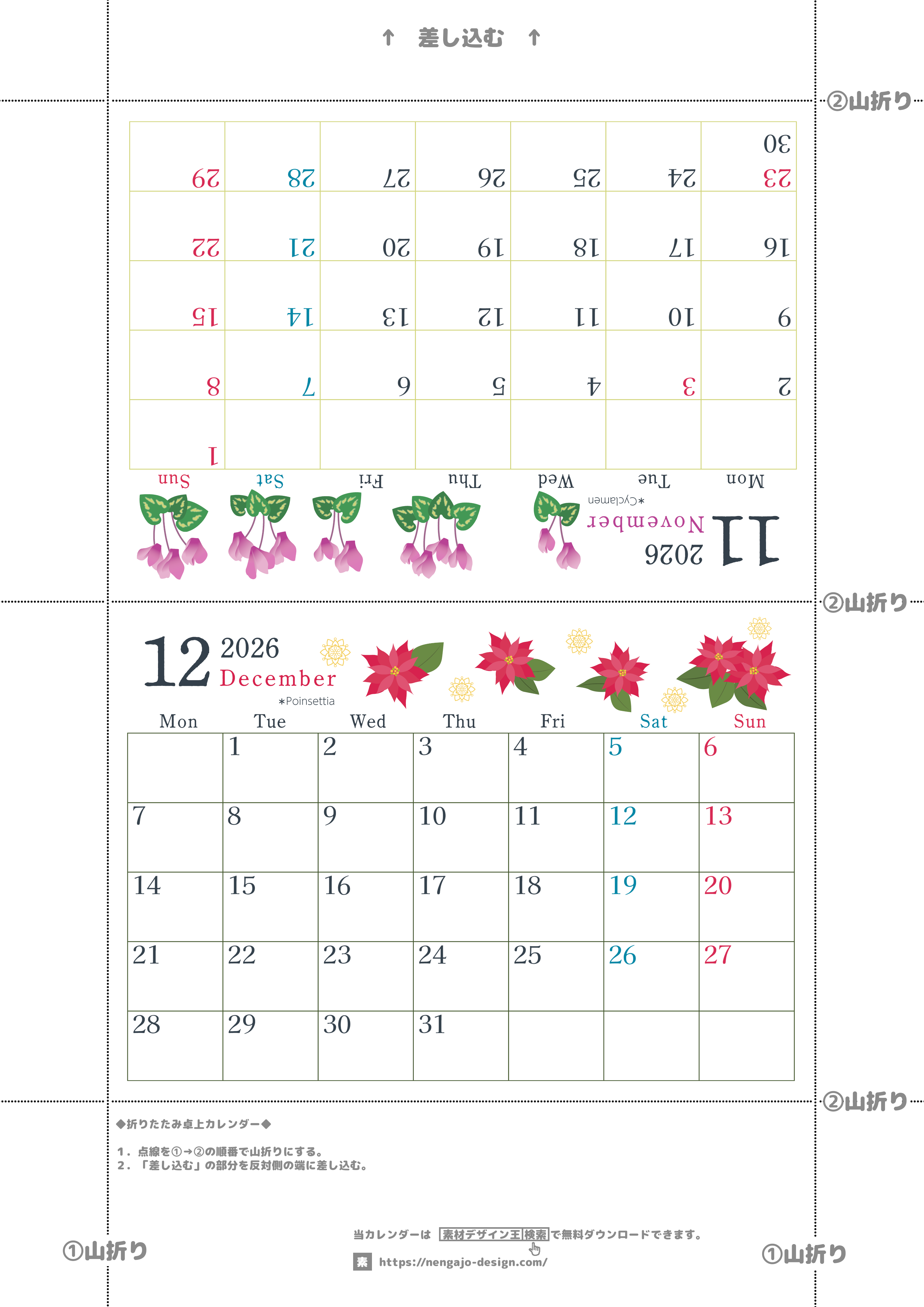 2026年・無料のカレンダーテンプレート 2026年の卓上カレンダー(11月・12月)は月曜始まり♪おしゃれなだけでなく使い方も簡単♪A4サイズ/プリント無料(2026-001911-1231) 素材状デザイン王 2025年4月14日 2026年の卓上カレンダー(11月・12月)は月曜始まり♪おしゃれなだけでなく使い方も簡単♪A4サイズ/プリント無料(2026-001911-1231) おしゃれ カレンダーデザイン-0019 11月 12月 草花 月曜始まり 卓上