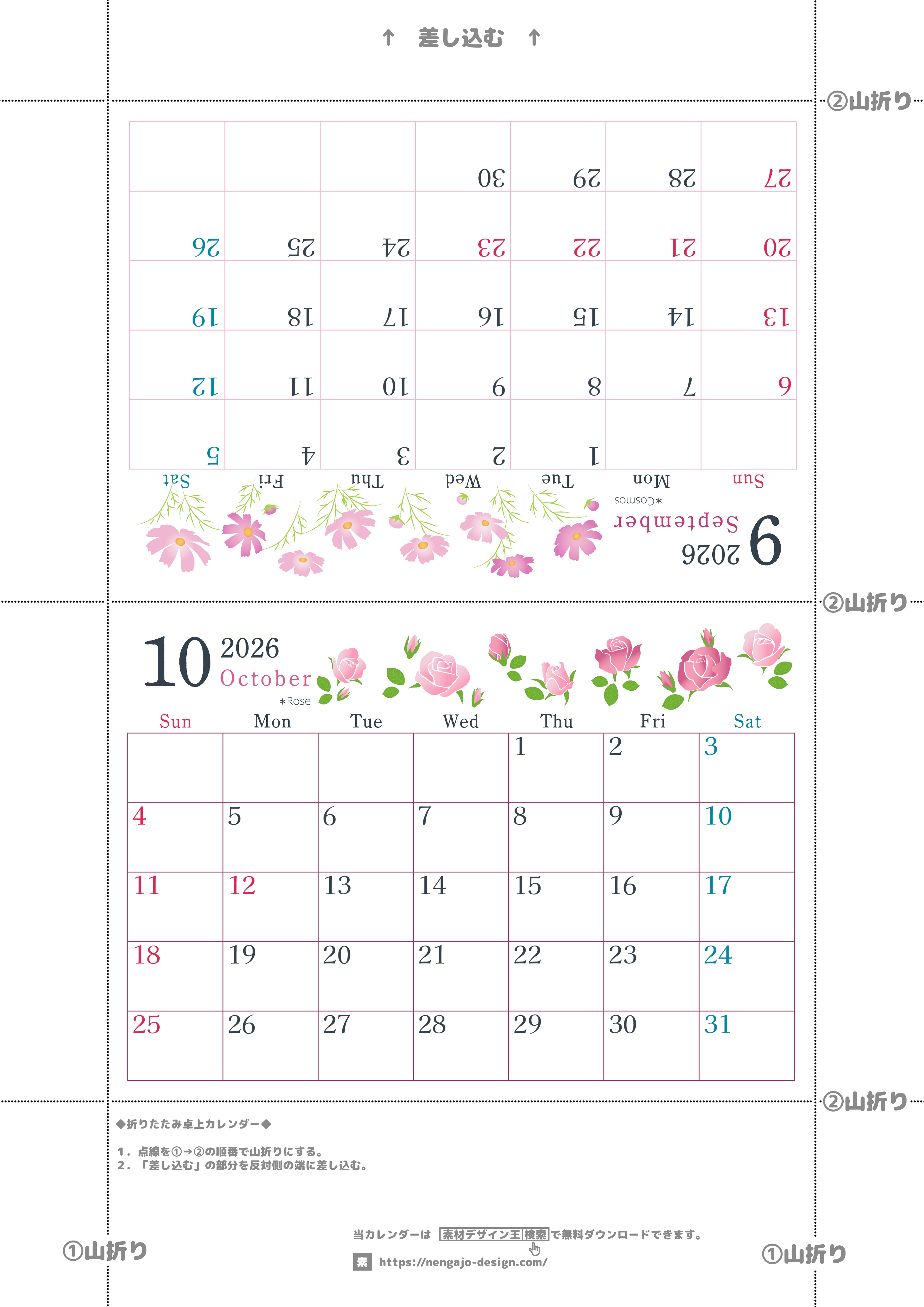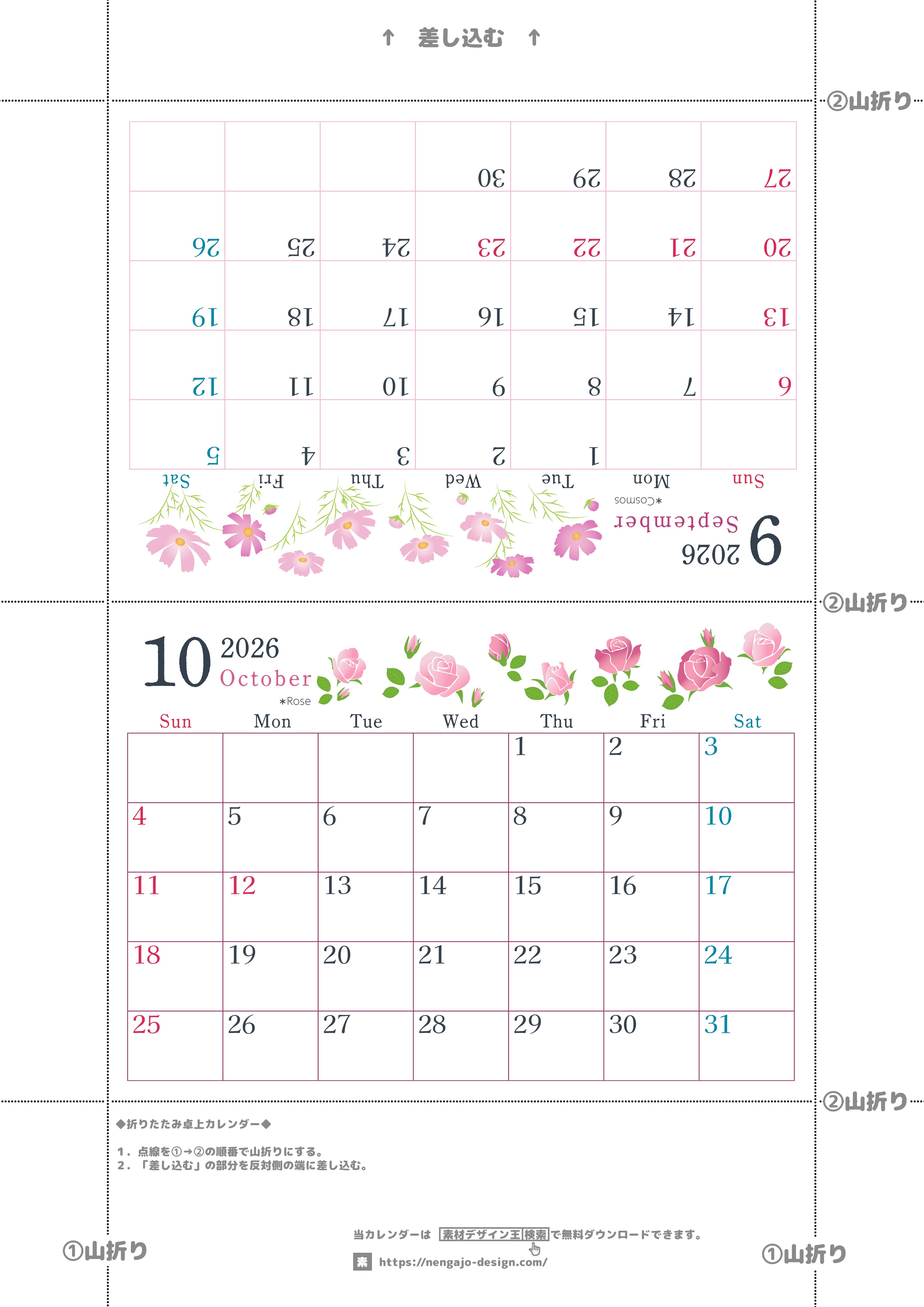 2026年・無料のカレンダーテンプレート 2026年の卓上カレンダー(9月・10月)は日曜始まり♪おしゃれなだけでなく使い方も簡単♪A4サイズ/プリント無料(2026-001909-1030) 素材状デザイン王 2025年4月14日 2026年の卓上カレンダー(9月・10月)は日曜始まりです。おしゃれなだけでなく使い方も簡単なちょうどいいA4サイズなのでプリントアウトして折りたたむだけです。ダウンロードは無料ですぐです。(2026-001909-1030) おしゃれ カレンダーデザイン-0019 9月 10月 草花 日曜始まり 卓上