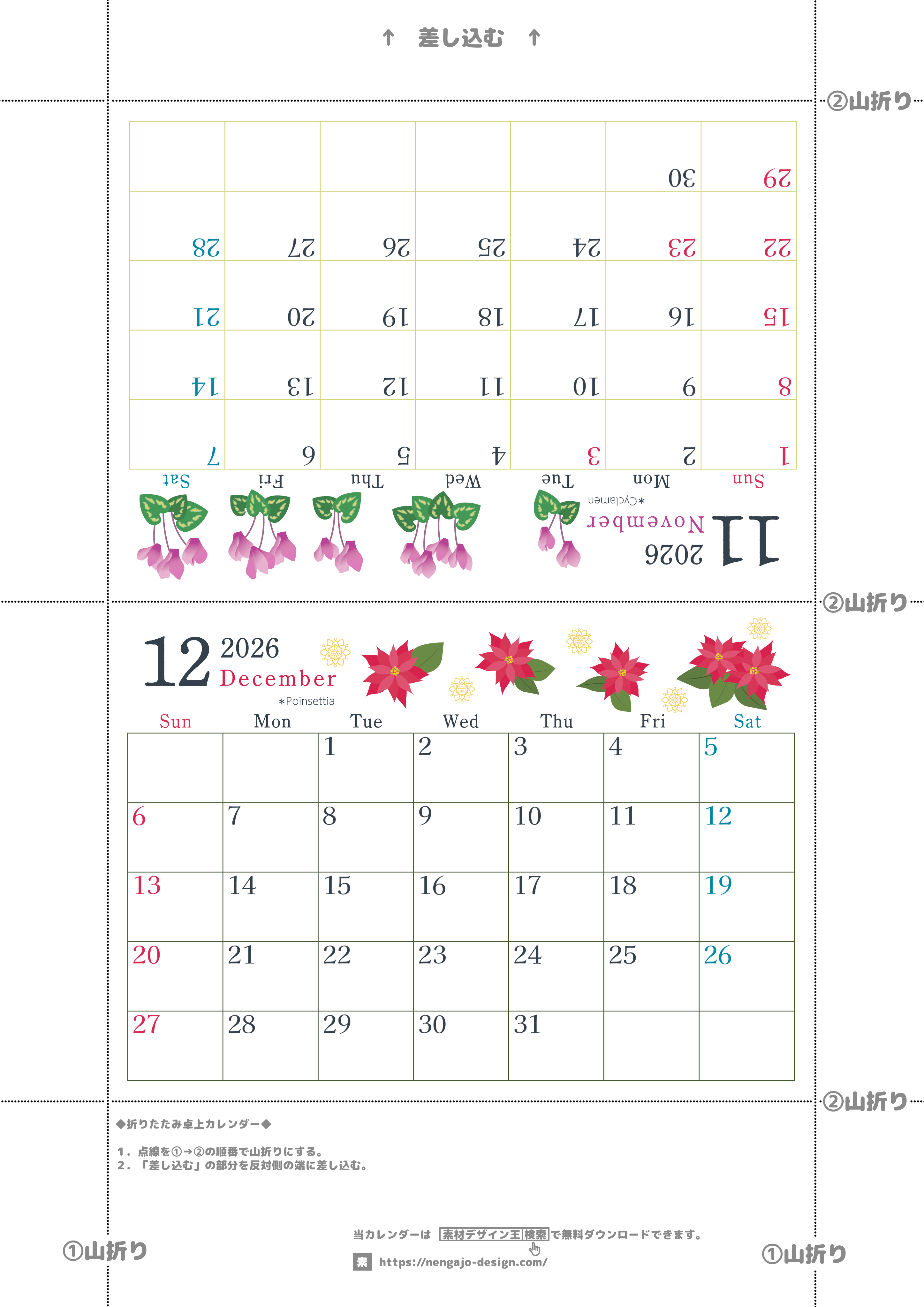 2026年の卓上カレンダー(11月・12月)は日曜始まりです。おしゃれなだけでなく使い方も簡単なちょうどいいA4サイズなのでプリントアウトして折りたたむだけです。ダウンロードは無料ですぐです。(2026-001911-1230)