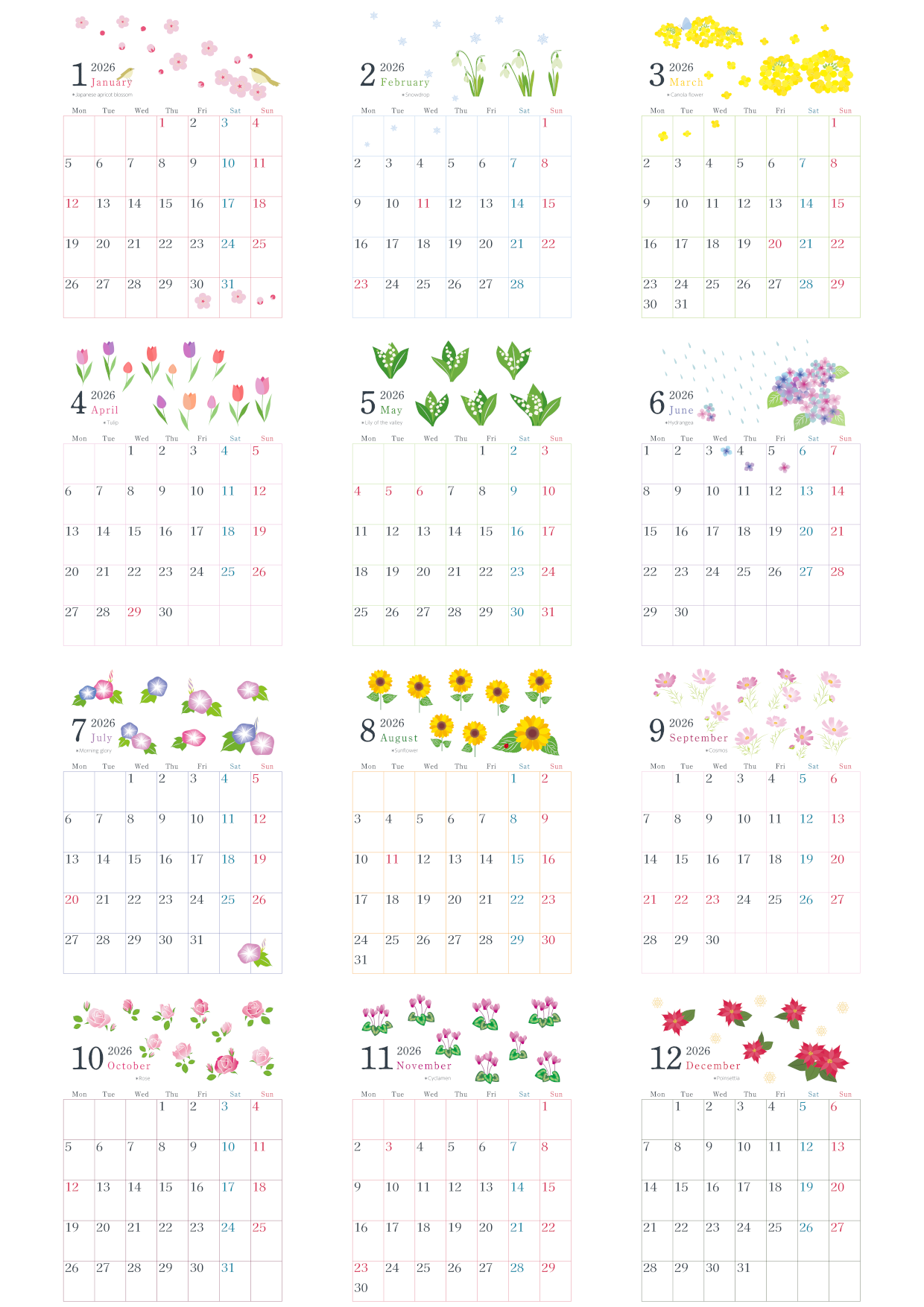 年間カレンダー2026を無料ダウンロードできます。A4縦型の月曜始まりで、見やすく優しい雰囲気の草花デザインが特徴です。視認性の高い数字と曜日が配置されており、年間の予定を快適に整理できます。落ち着いたデザインで長く使える実用的カレンダーです。